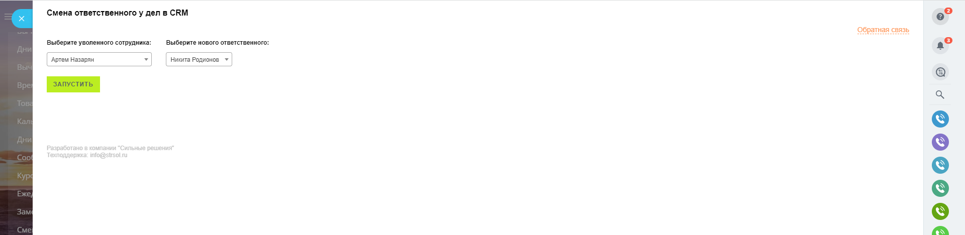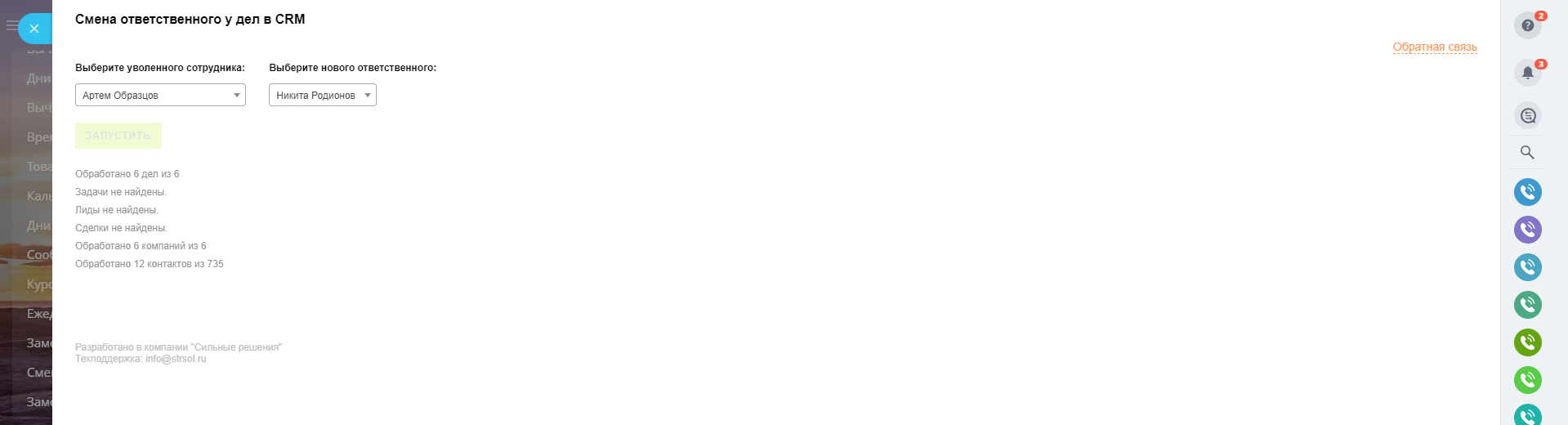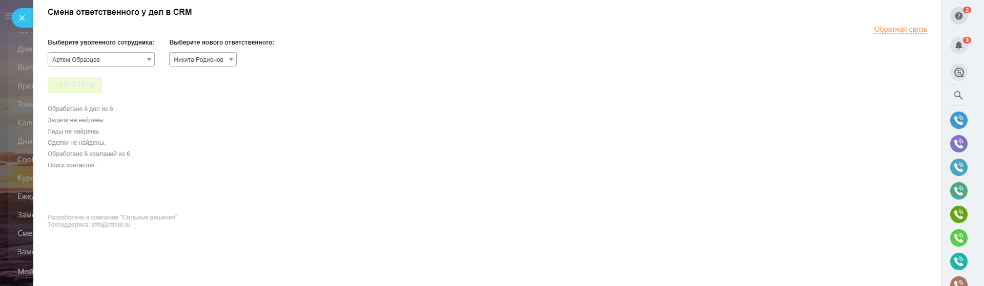 Приложение позволяет быстро передать все дела CRM одного пользователя на другого. Очень востребовано, когда необходимо сменить уволенного сотрудника у всех элементов CRM.