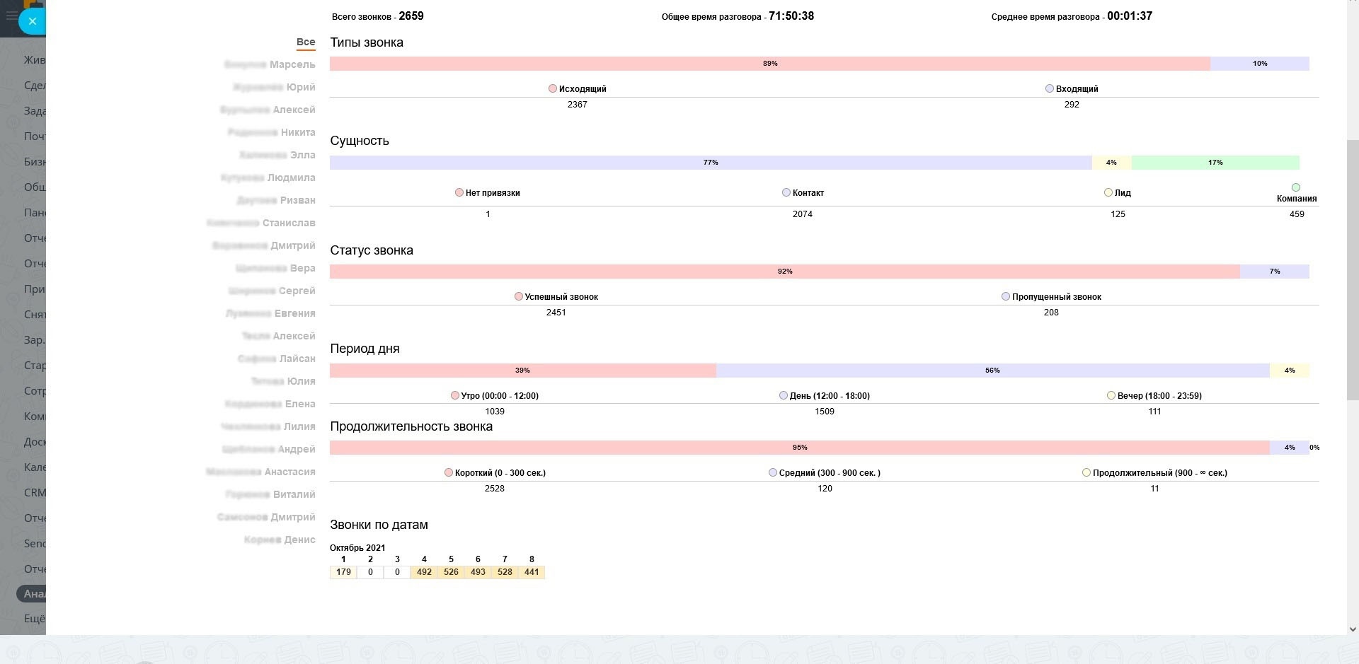 В отчете также доступны следующие показатели: общее количество звонков, общее время разговоров и средняя продолжительность разговора по каждому менеджеру.