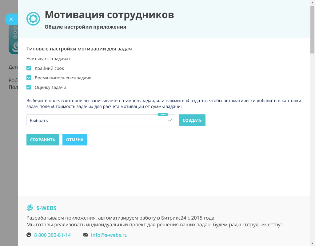 С помощью этого приложения вы сможете устанавливать мотивацию для сотрудников в задачах и формировать отчет по размеру премии за их выполнение.