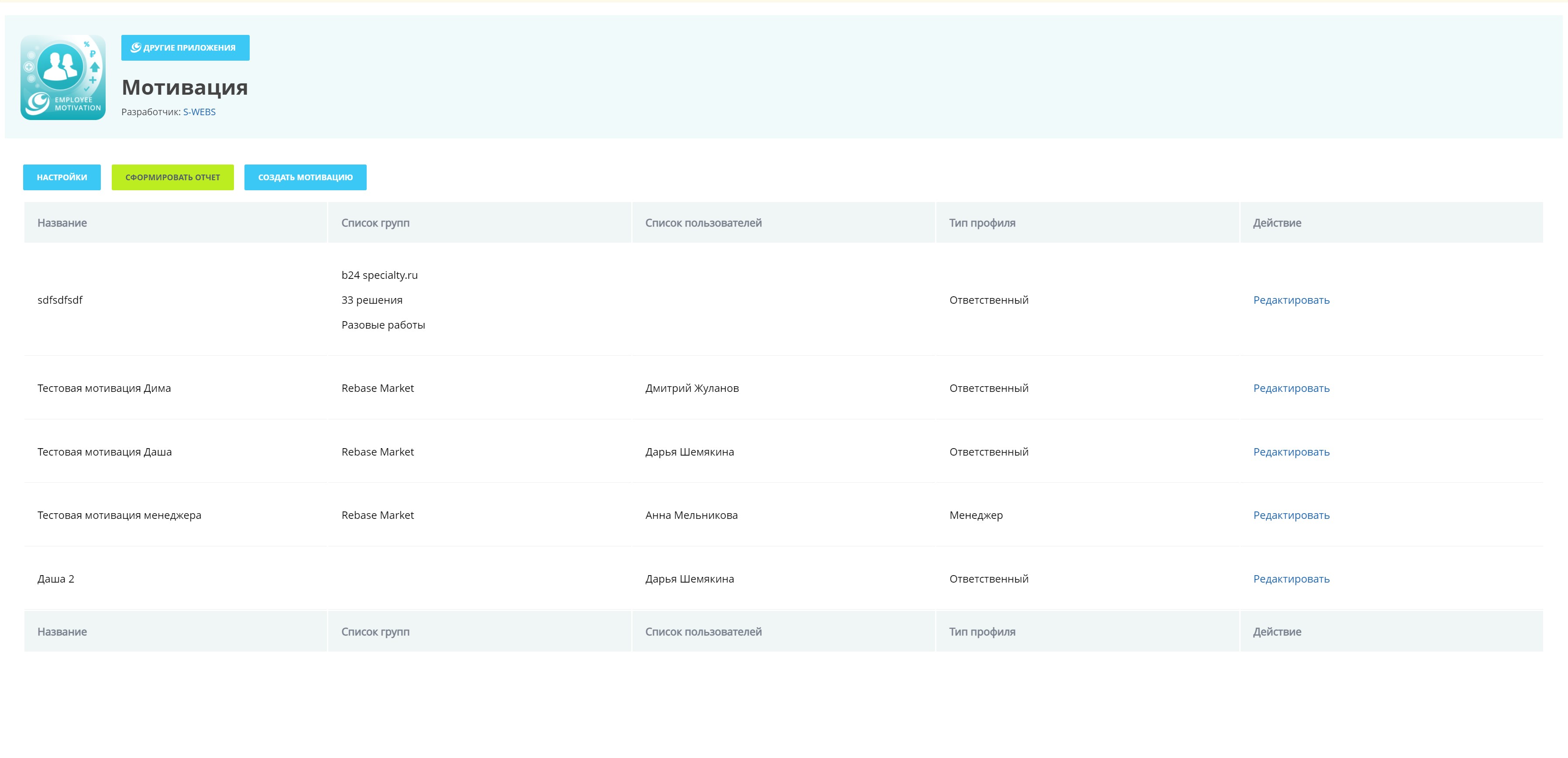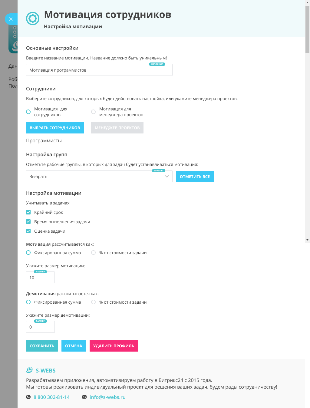 - Установка мотивации для разных групп сотрудников. Например, вы можете сделать отдельные профили мотивации для программистов, верстальщиков и руководителей отделов.