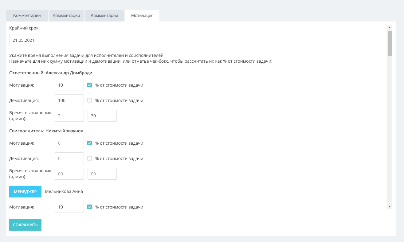 - Настройка расчета мотивации за выполнение задач в зависимости от крайнего срока, времени выполнения задачи или ее оценки. Размер вознаграждения можно рассчитывать как фиксированную сумму или % от стоимости задачи.