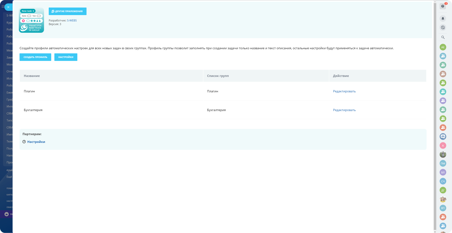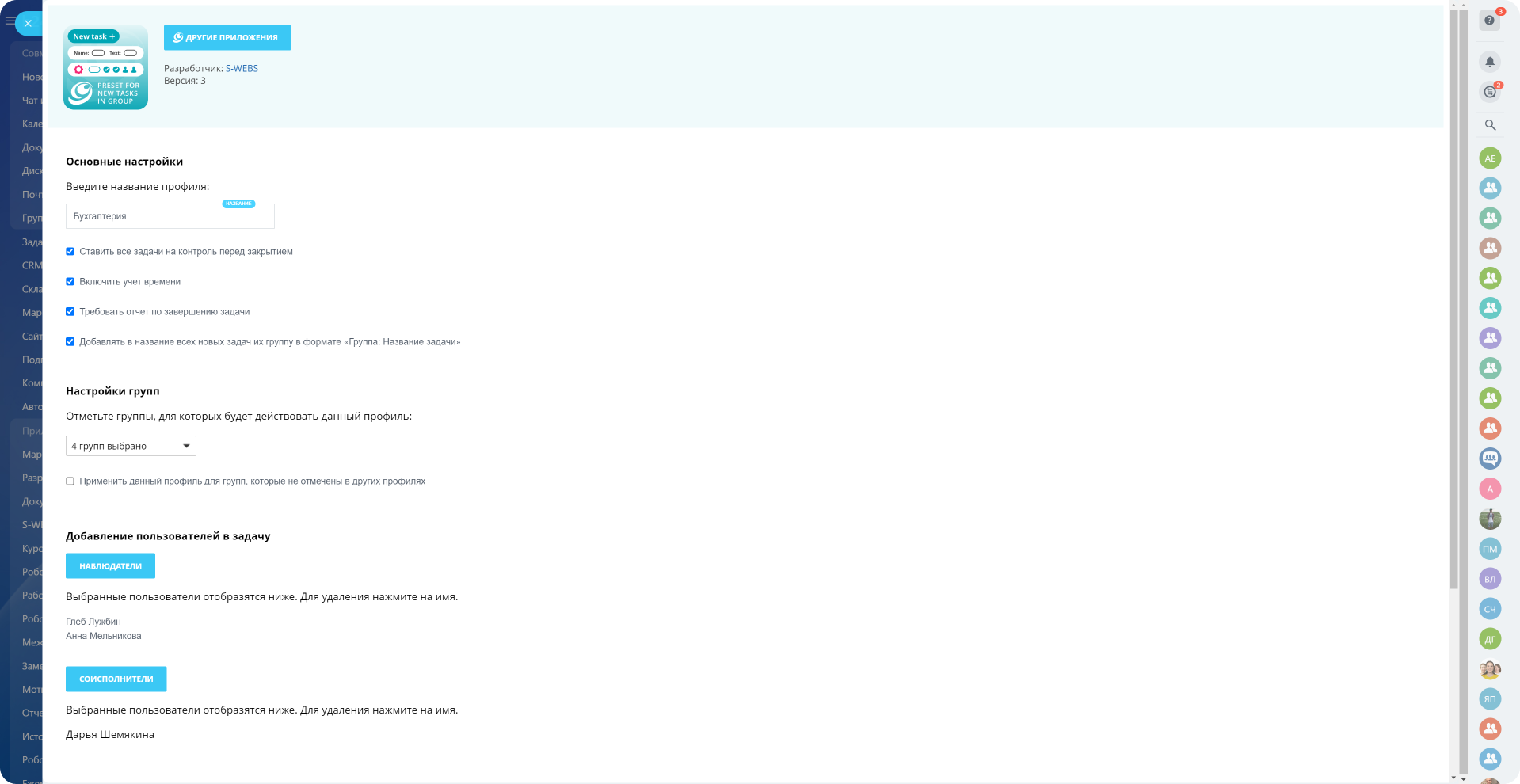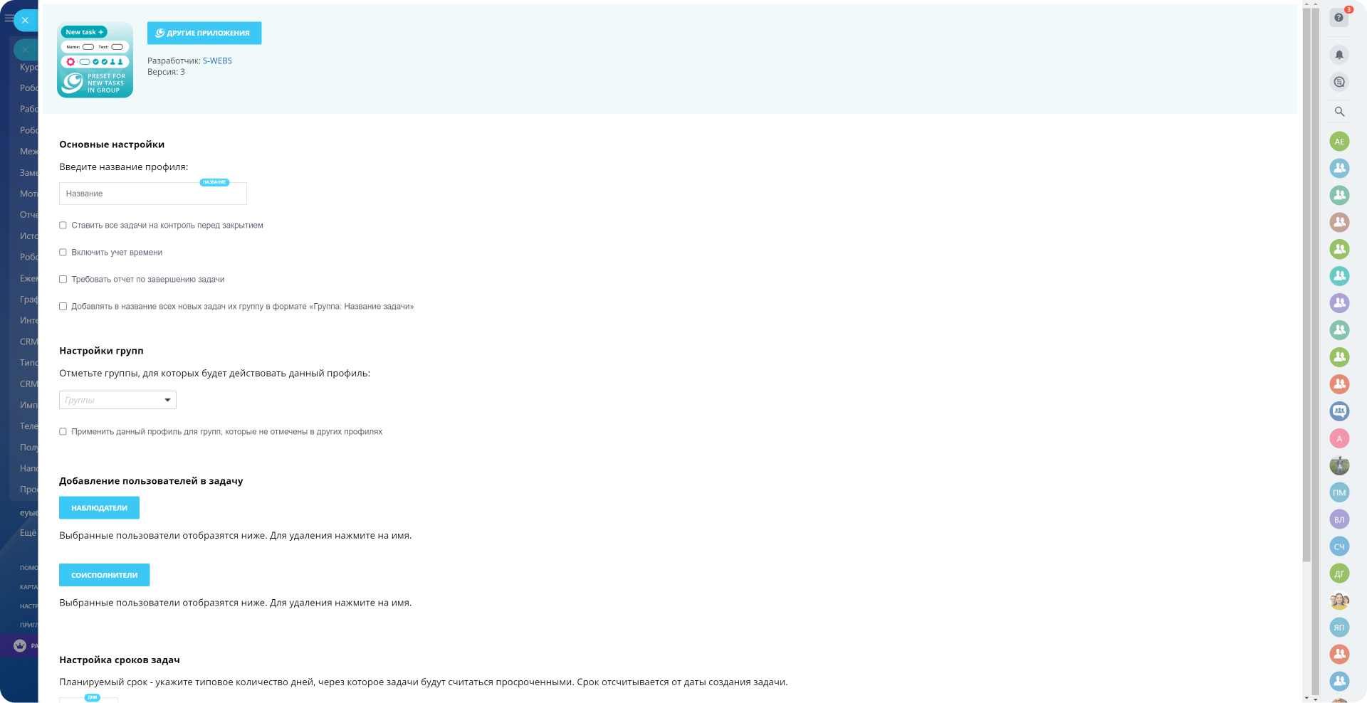 Приложение позволяет задать настройки по умолчанию для всех новых задач в выбранных рабочих группах: автоматическое назначение соисполнителей и наблюдателей, установка сроков задач и уведомлений для сотрудников.
