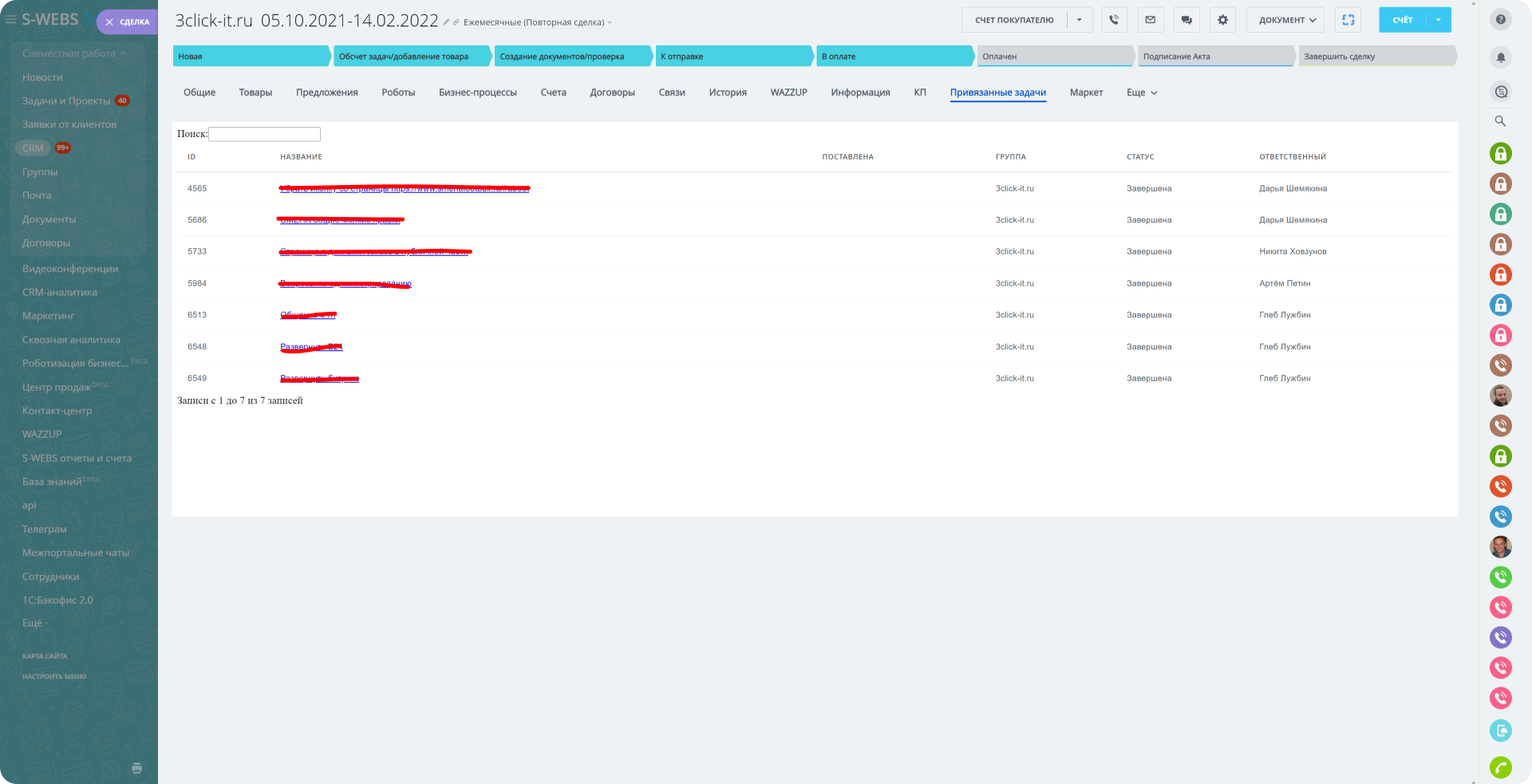 При переходе на вкладку вы и ваши сотрудники сможете просматривать список всех привязанных к сделке задач в виде таблицы, в которой указаны их ID, названия, дата постановки и группа.