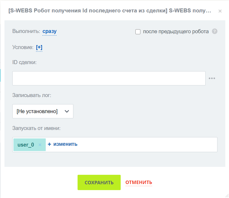 Робота необходимо поместить в нужную стадию движения сделки и настроить условия для его запуска.