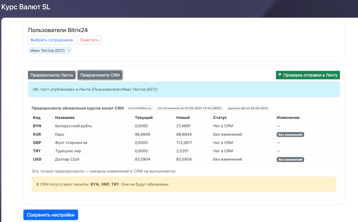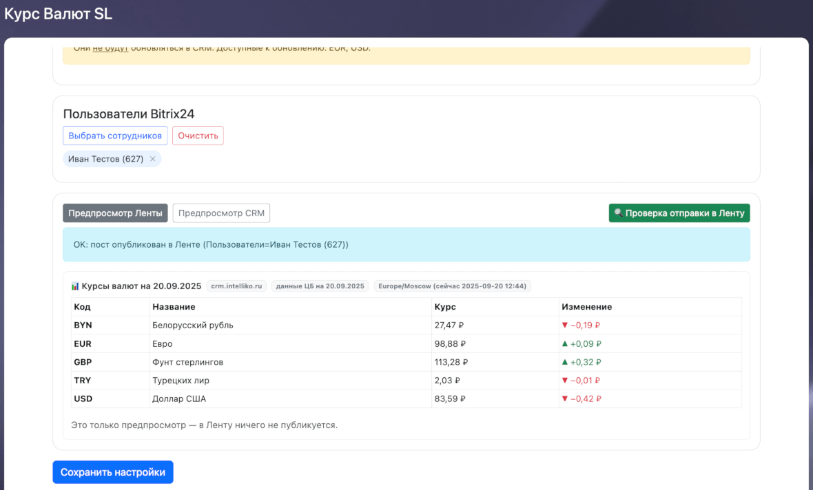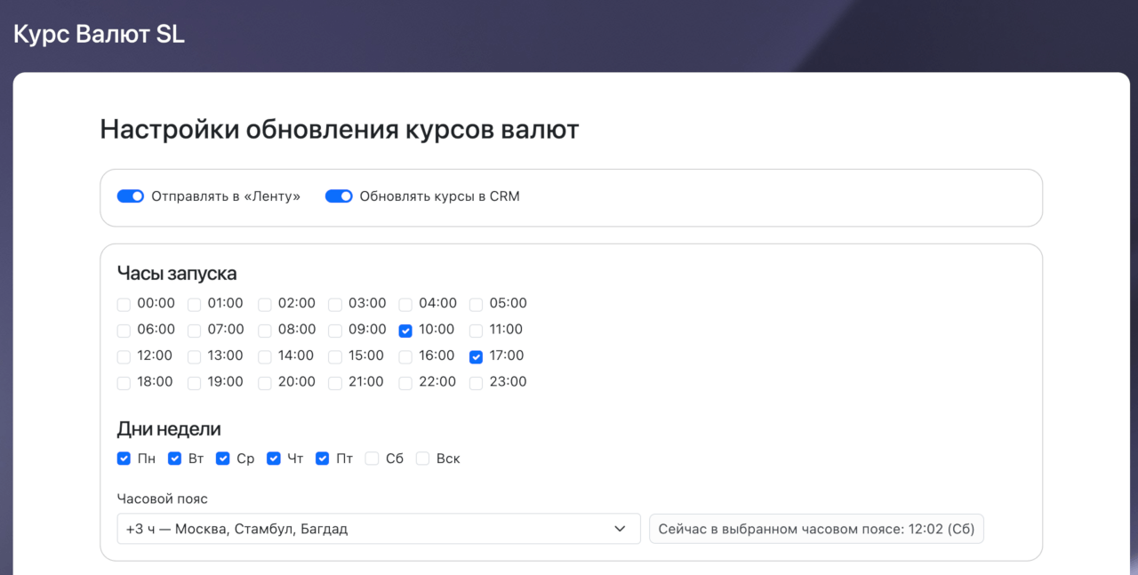 - Гибкие настройки: часы/дни запуска, часовой пояс, выбор валют, выбор сотрудников.
