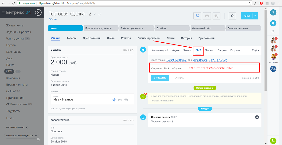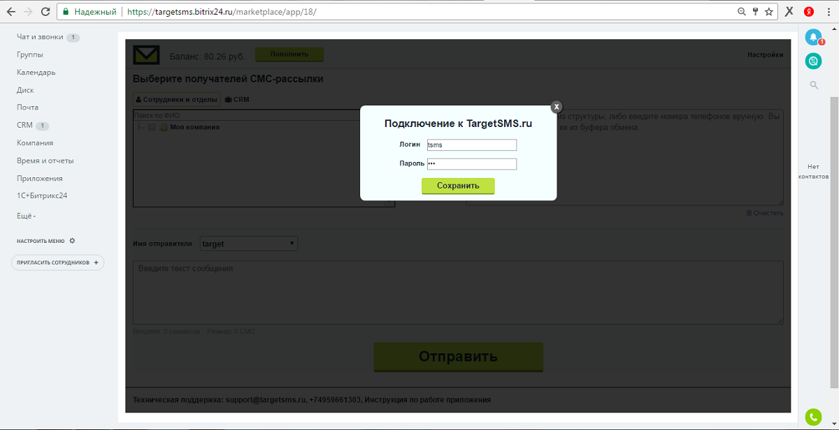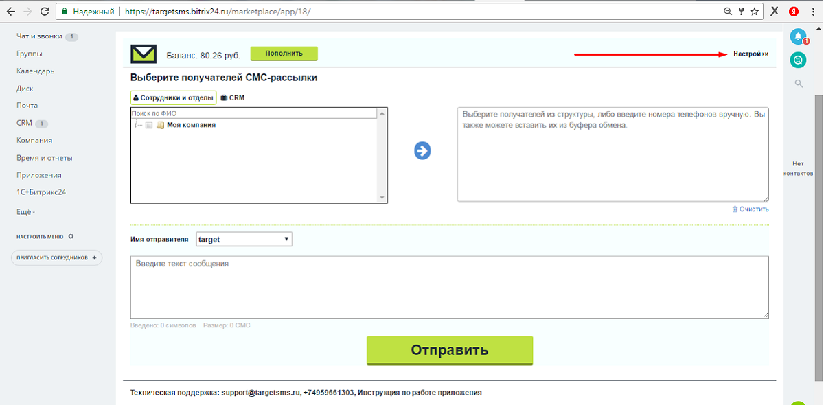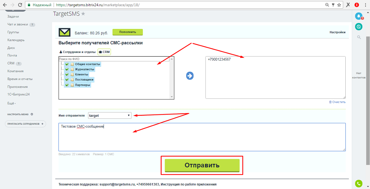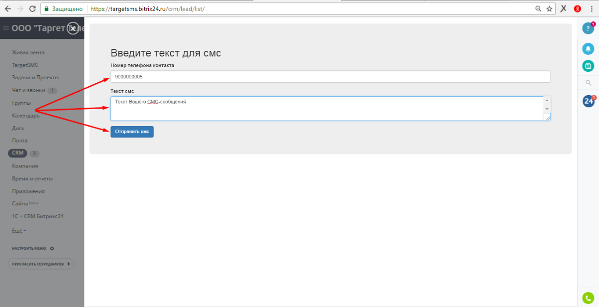 Подробная инструкция по работе приложения TargetSMS находится тут: http://targetsms.ru/otpravka-sms-iz-bitrix24Поддержка