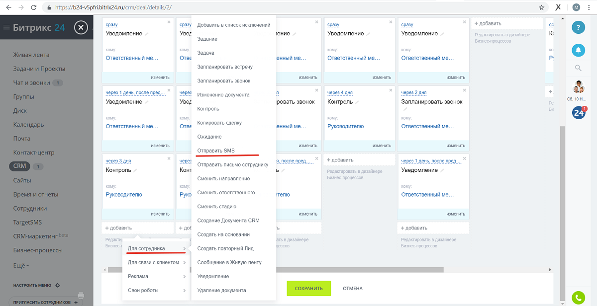 - Автоматическая отправка СМС-сообщений в зависимости от стадии сделки/лида.