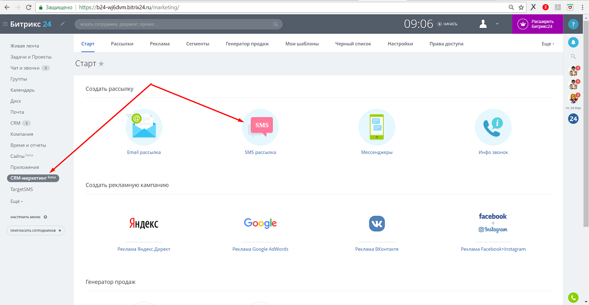 - Пройдите в меню "CRM-маркетинг" и выберите "SMS рассылка";