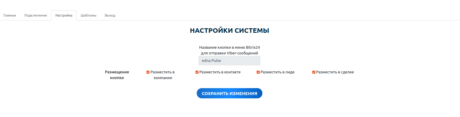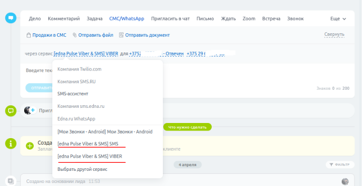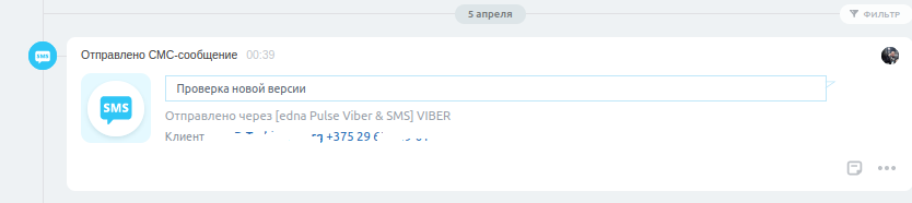 Приложение обеспечивает отправку (рассылку) сообщений по каналам смс и Viber через провайдера edna Pulse. Возможна как отправка одиночного сообщения из карточки контакта, так и рассылка с использованием заранее подготовленных шаблонов.
