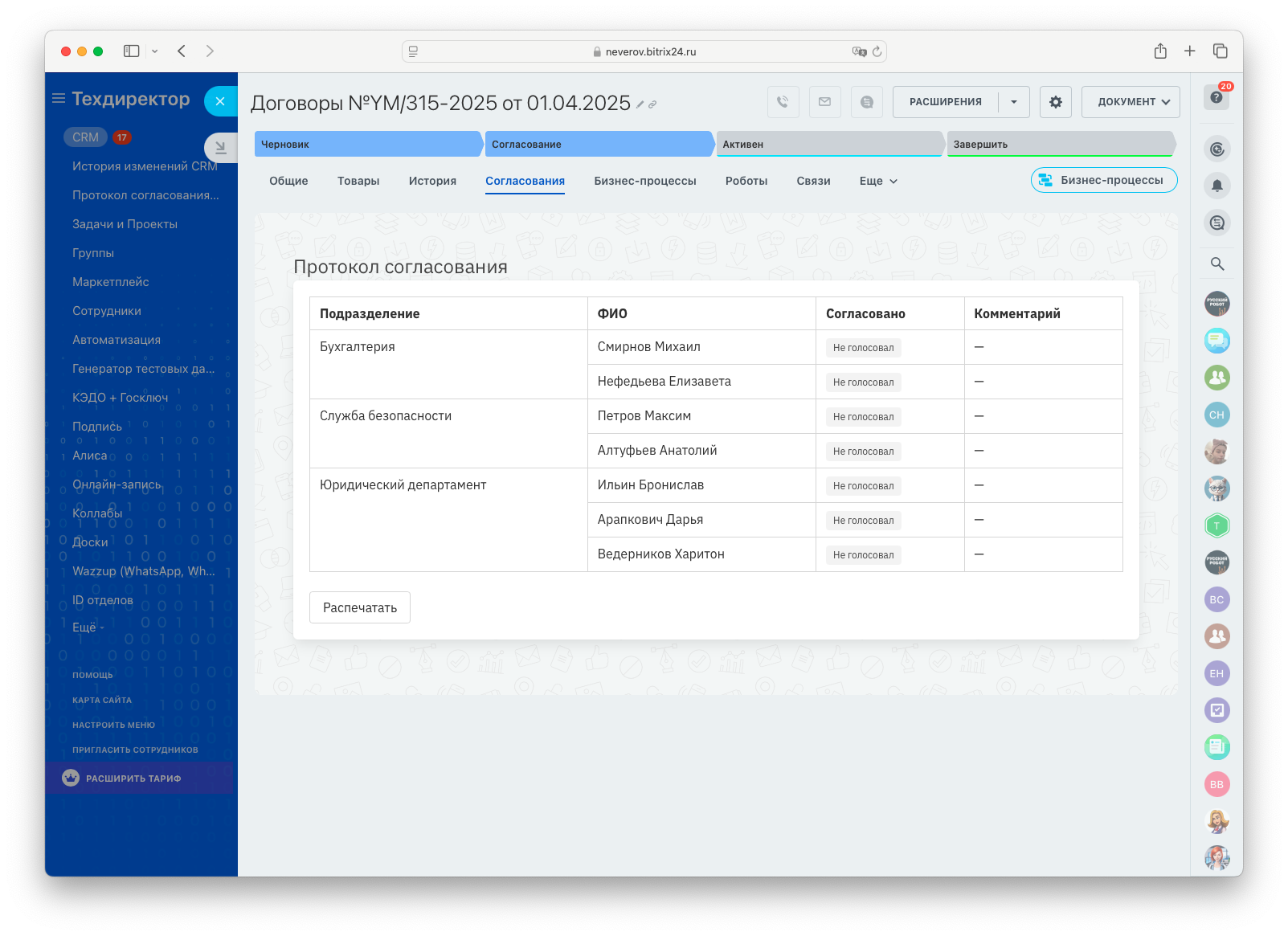Модуль предоставляет ряд действий для роботов и бизнес-процессов Битрикс24, позволяющих фиксировать информацию о том, как проходила процедура согласования документа, а в процессе предоставляет возможность просмотреть протокол согласования со сводной информацией по всем согласующим.
