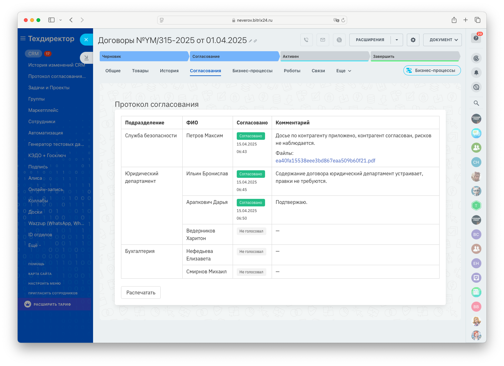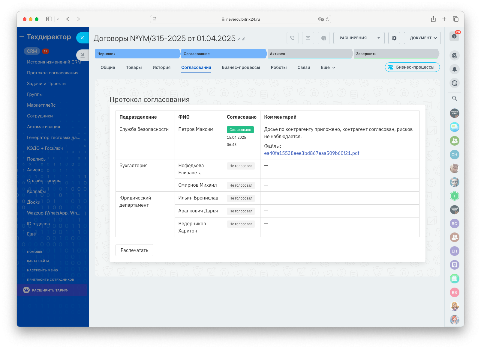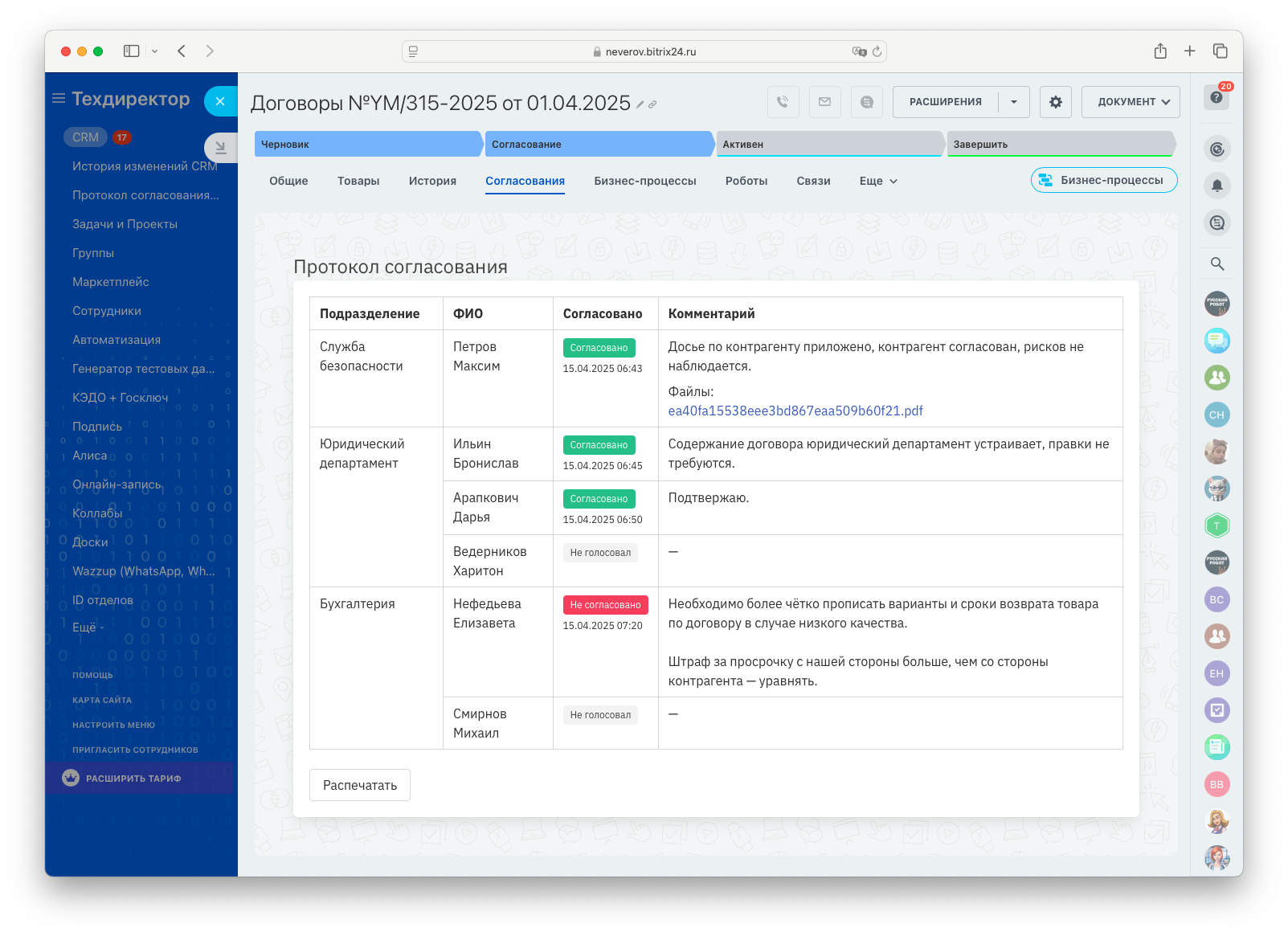 Показывает в карточках CRM и смарт-процессов вкладку с результатами согласования объекта разными сотрудниками портала. По каждому согласованию показывает дату и время, комментарий и приложенные файлы.