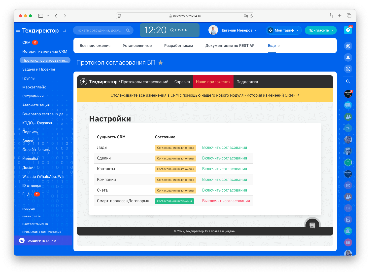 После установки в интерфейсе приложения вам необходимо для нужных вам объектов CRM (лидов, сделок, контактов, компаний или смарт-процессов) включить вкладку согласований.