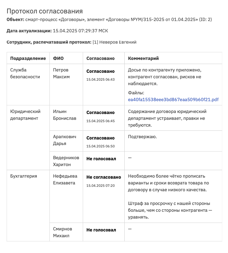Вместе с решением вы можете также зафиксировать комментарий, оставленный сотрудником и приложенные им к комментарию файлы. - Очистить таблицу согласований — позволяет «сбросить» протокол согласования, в случае, когда принято решение начать согласование заново.