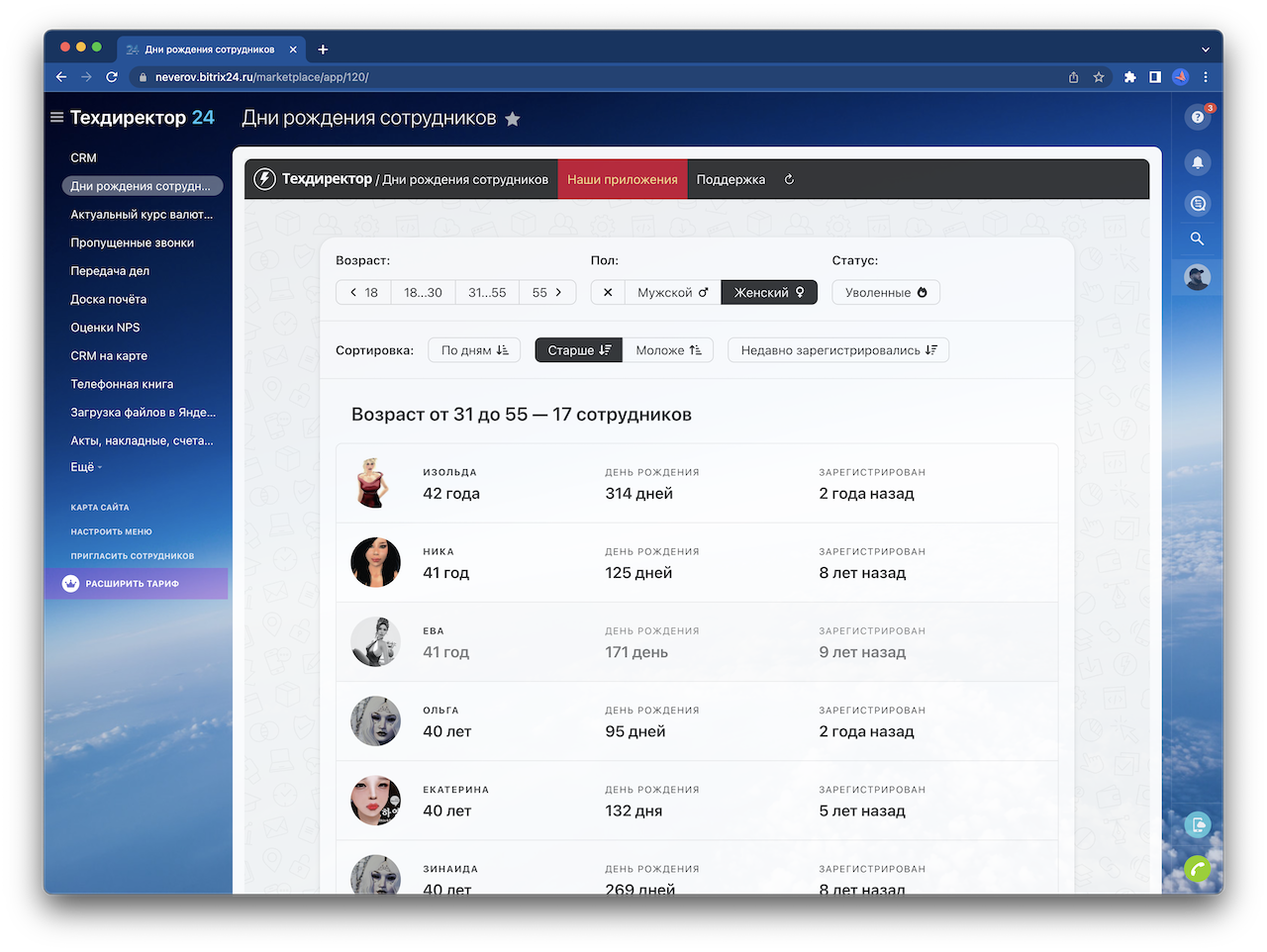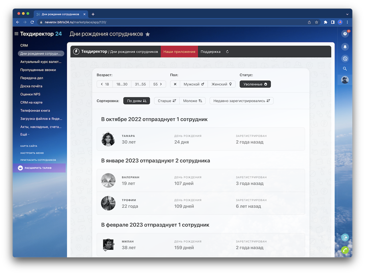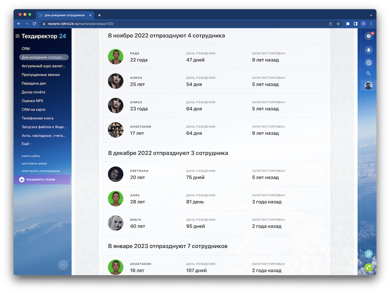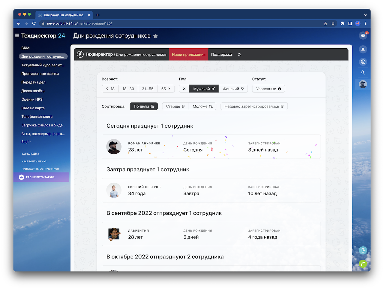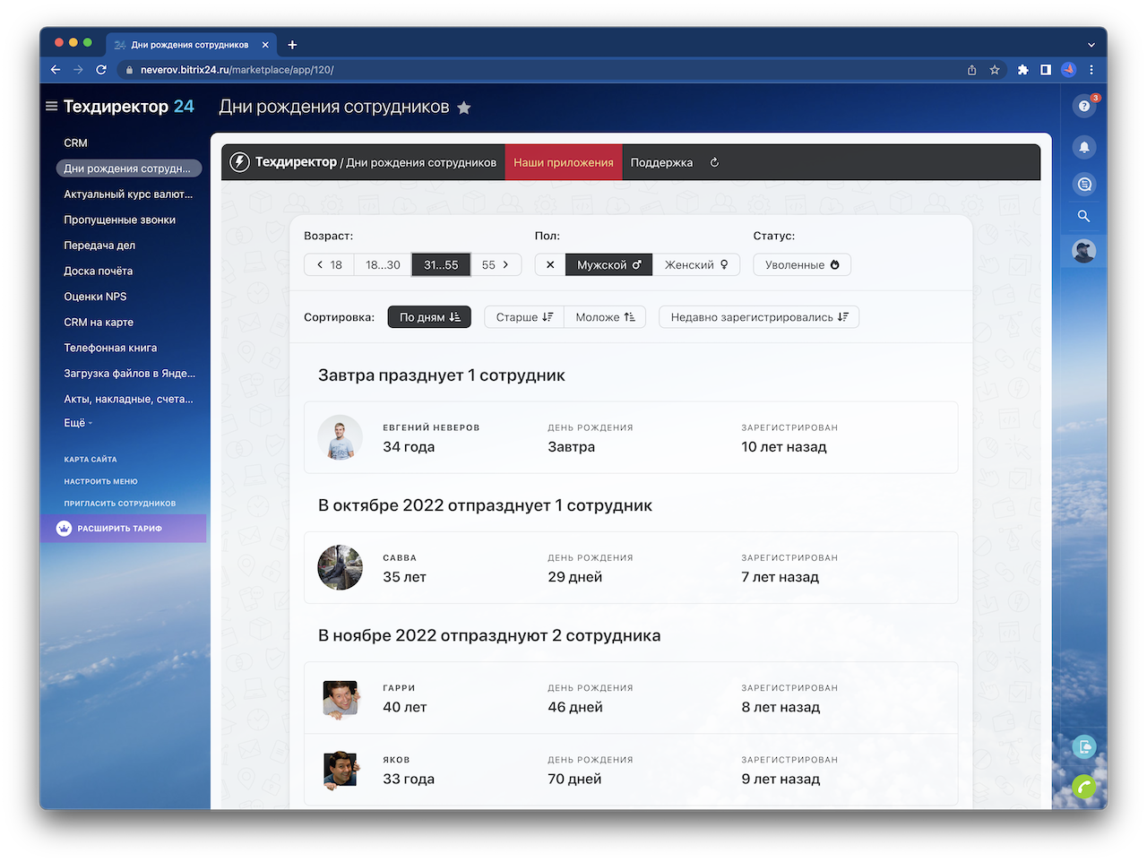 Самое толковое приложение, которое есть по ДР: удобный интерфейс и даже есть дата регистрации в Битрикс - можно использовать для поздравления коллег с каждым новым годом работы в компании.