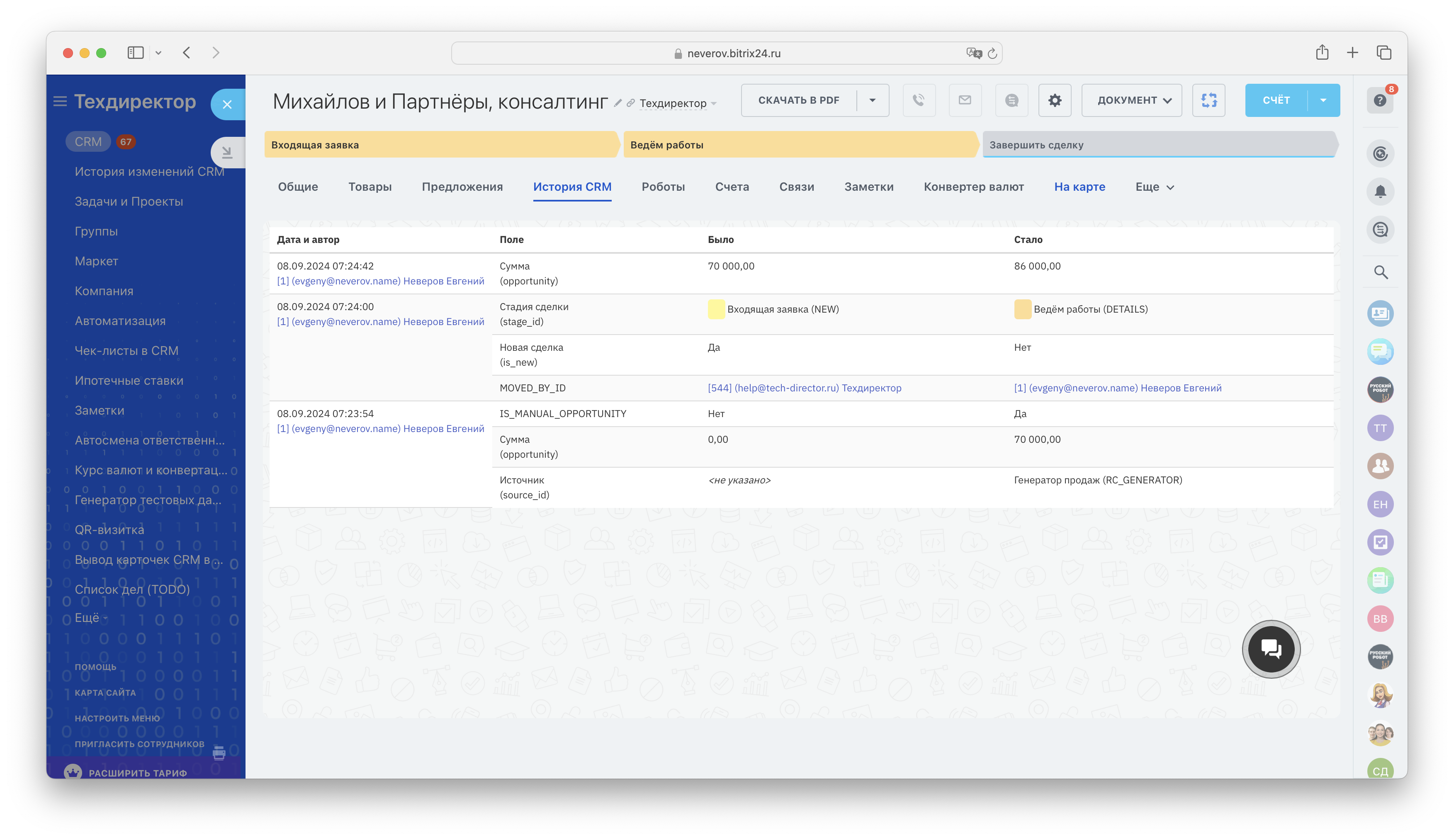 Сохраняет историю изменений сделок, лидов, компаний, контактов и смарт-процессов. Позволяет видеть историю изменений и тех, кто производил эти изменения.