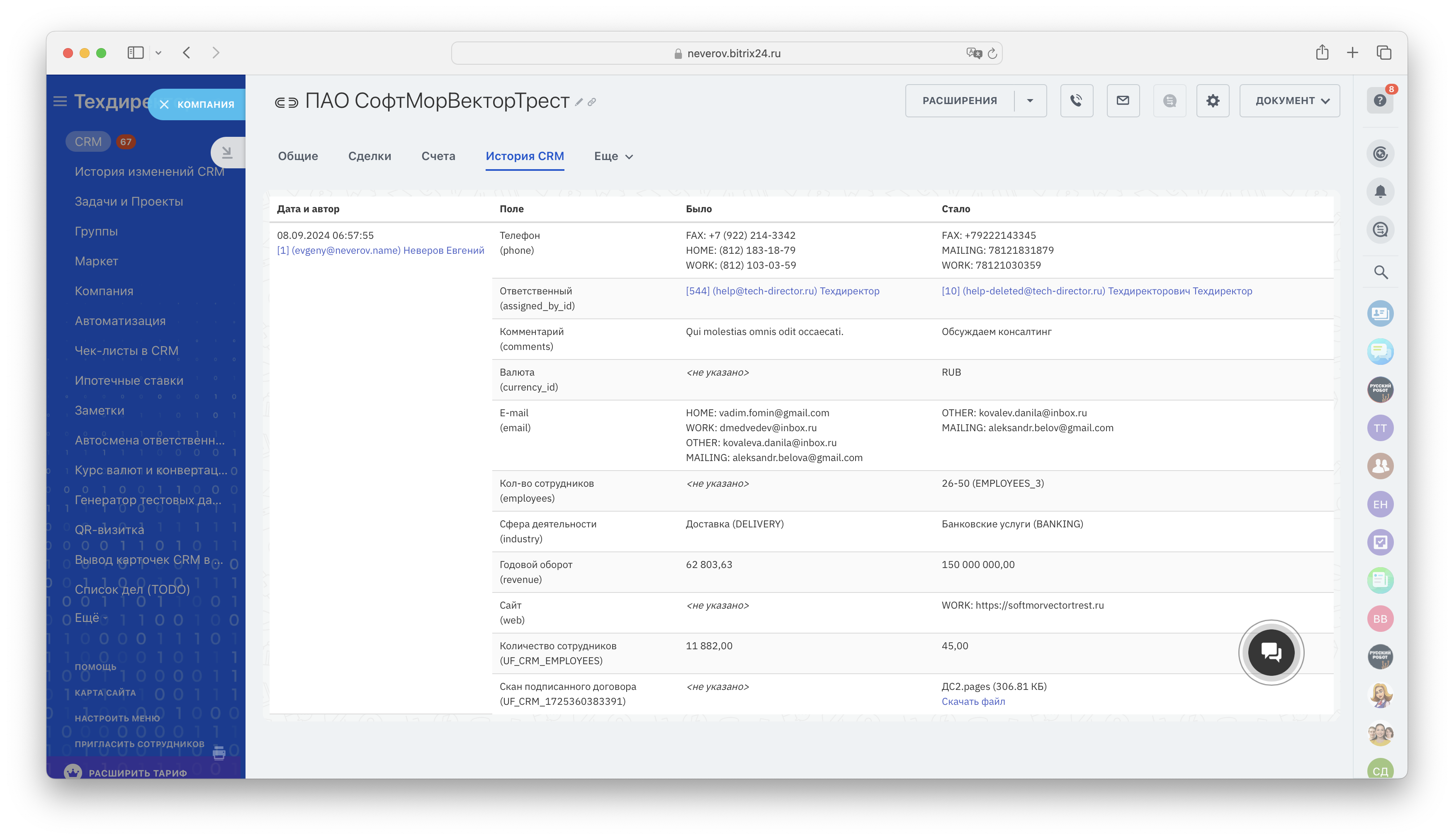Модуль отвечает на извечный вопрос клиентов: кто из сотрудников что-то поменял в CRM. В отличие от стандартной вкладки «История» в объектах CRM, наше решение регистрирует изменение всех полей (включая системные), а также всех пользовательских свойств ваших объектов.