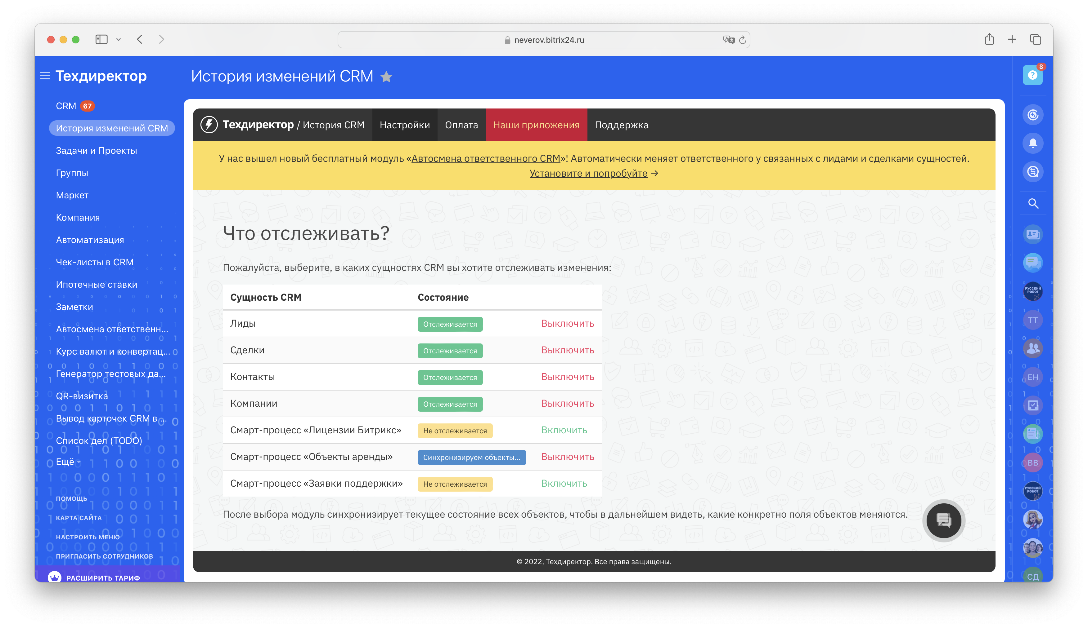 Наш модуль «История изменений CRM» после установки автоматически начинает отслеживать все изменения объектов, за которыми вы хотите следить: