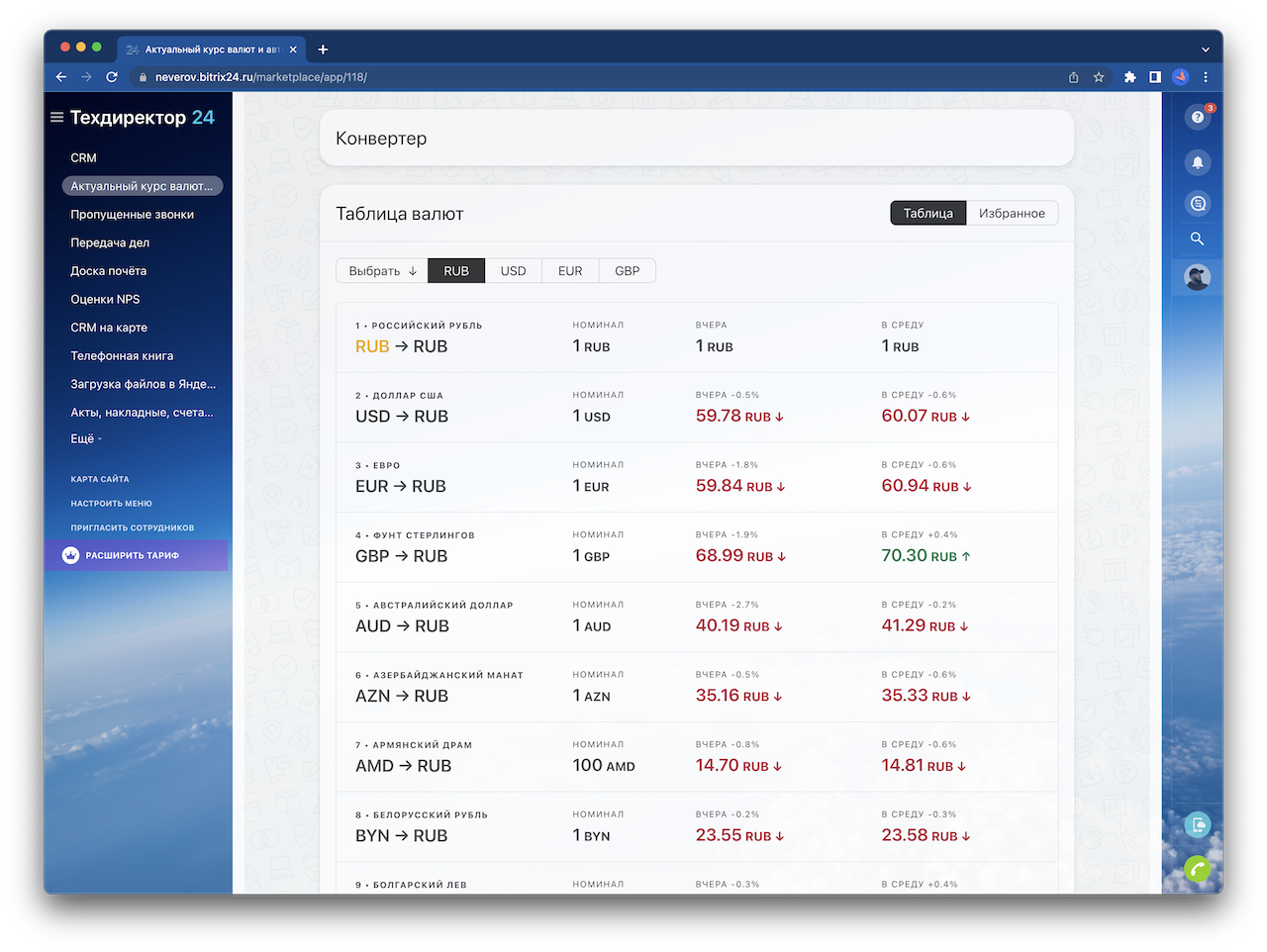 Модуль в автоматическом режиме обновляет курсы валют в настройках вашей CRM-системы и держит их всегда в актуальном состоянии.