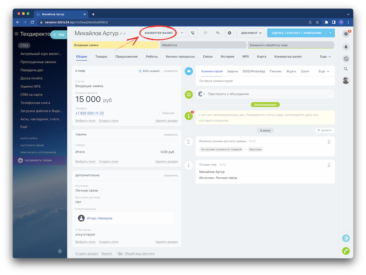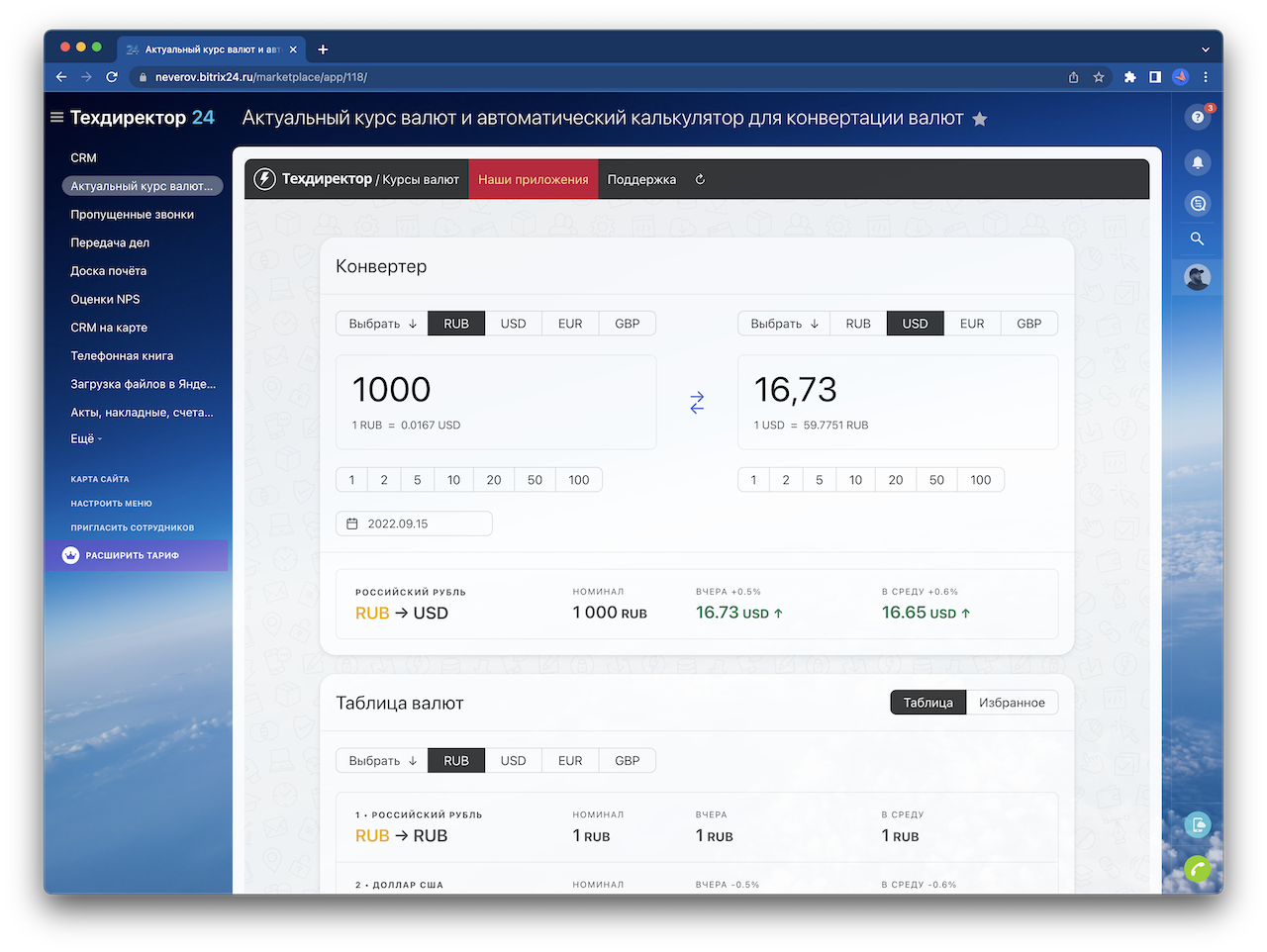 На странице модуля предоставлен удобный калькулятор, моментально пересчитывающий любые суммы из одной валюты в другую. Модуль всегда под рукой: в интерфейсах CRM всегда рядом кнопка открытия конвертатора валют: в списках и карточках лидов, сделок, счетов и коммерческих предложений.