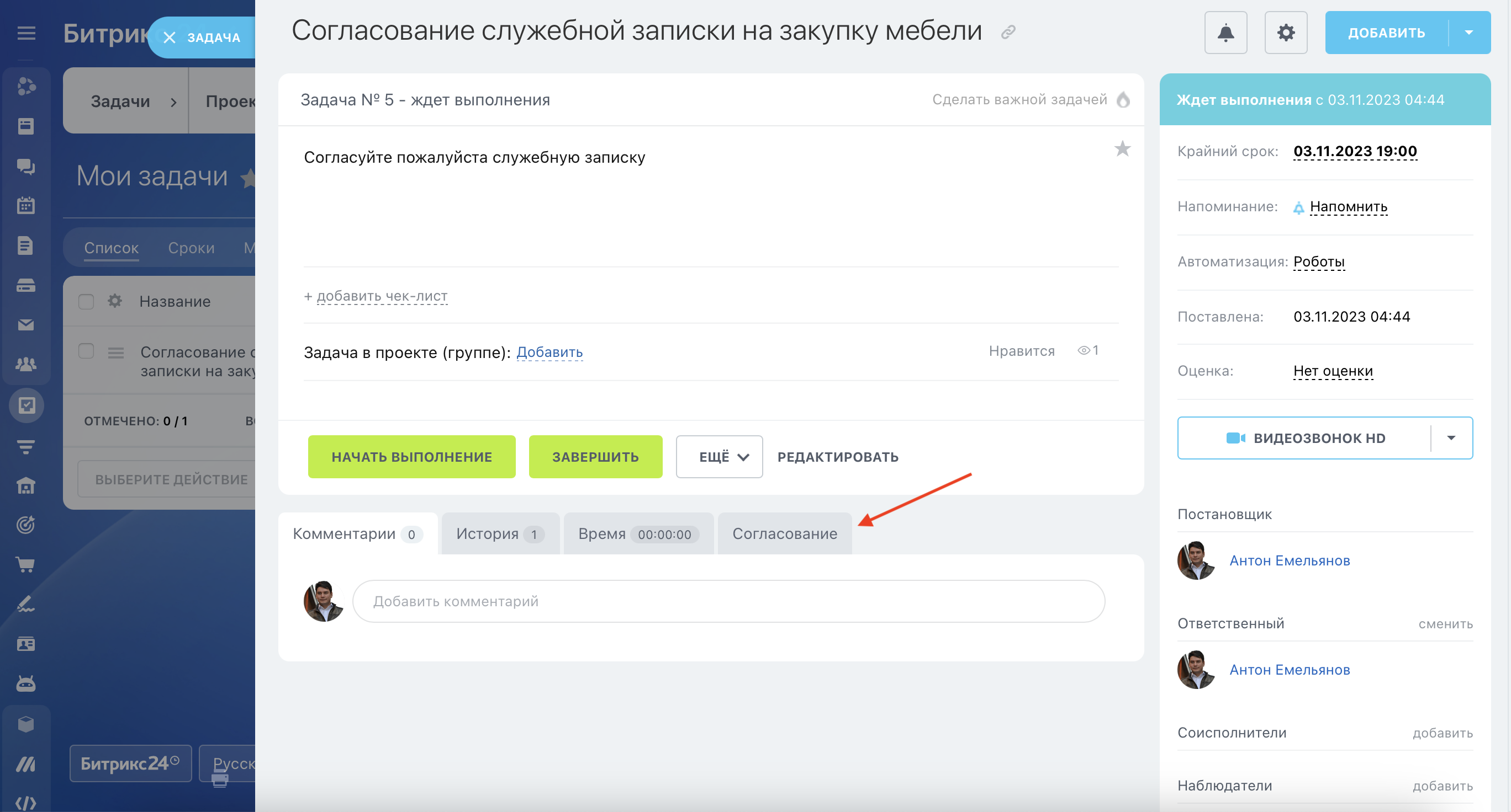 - После установки приложения в задачах появится новая вкладка - Согласование