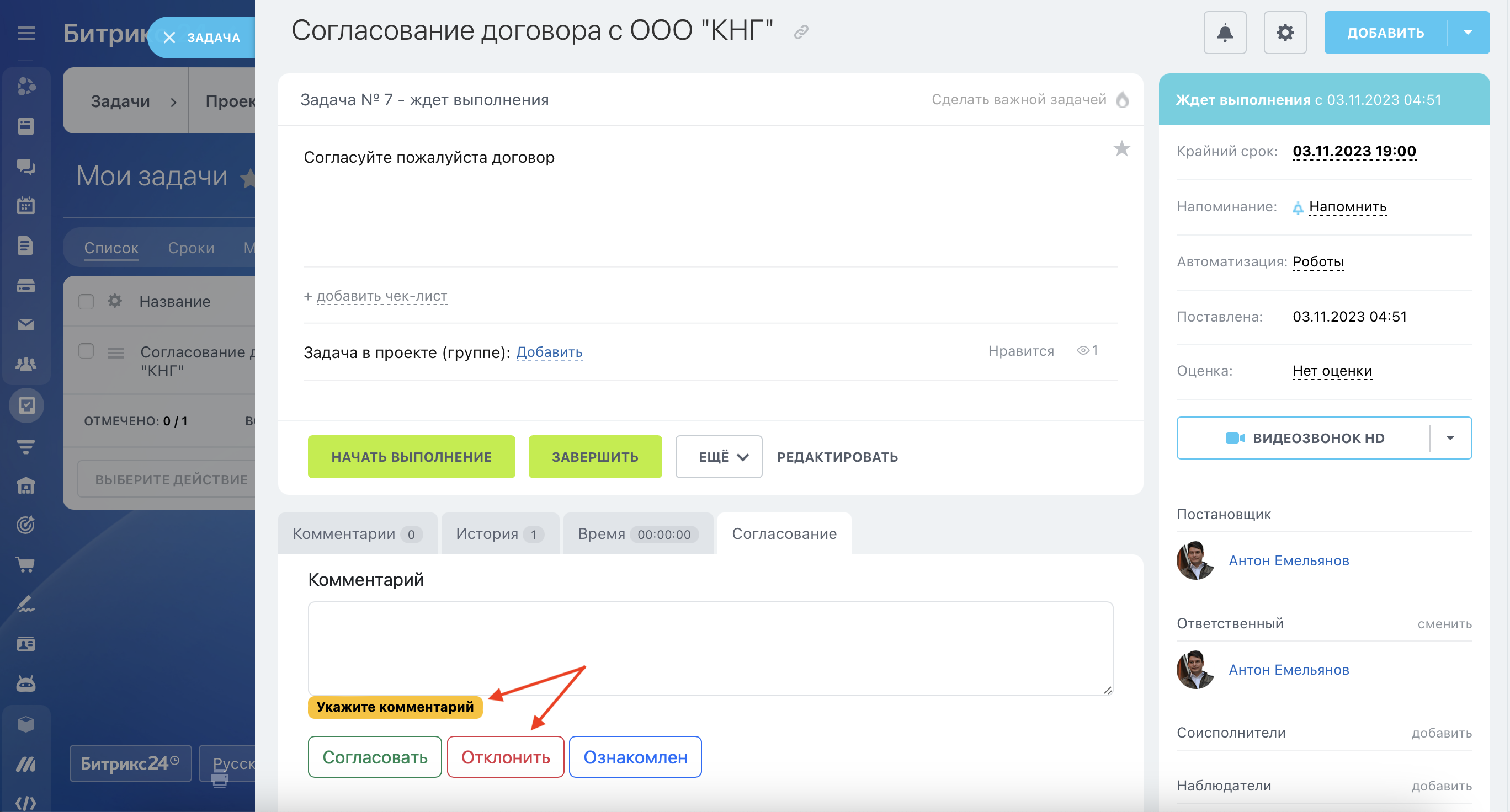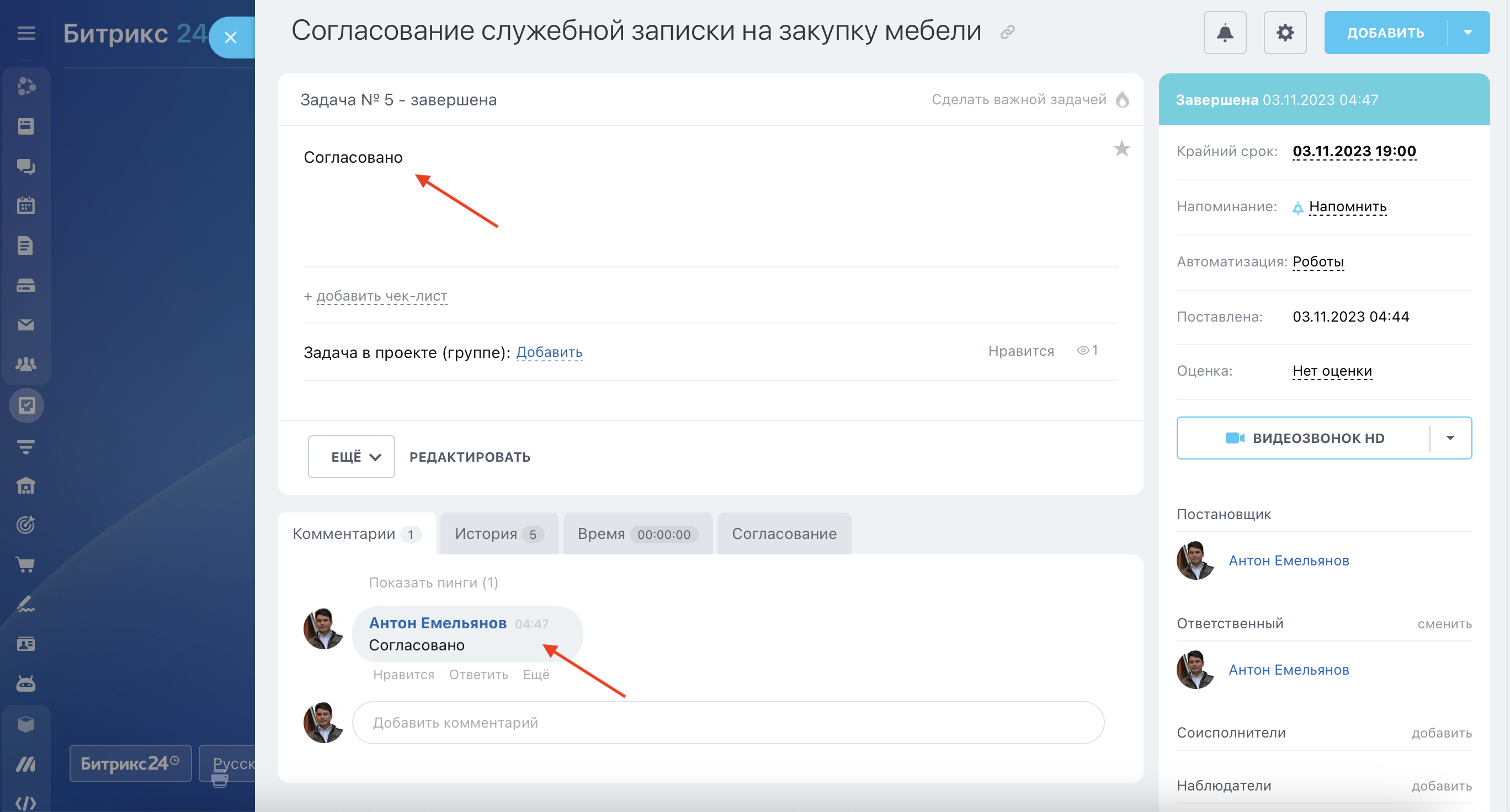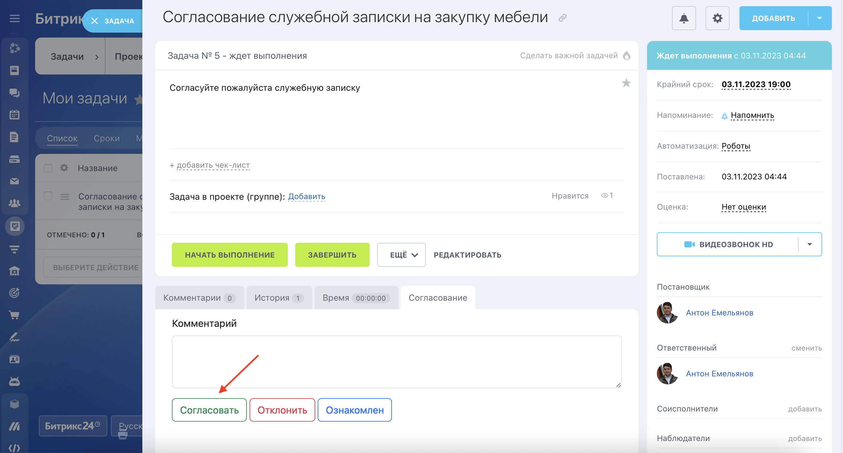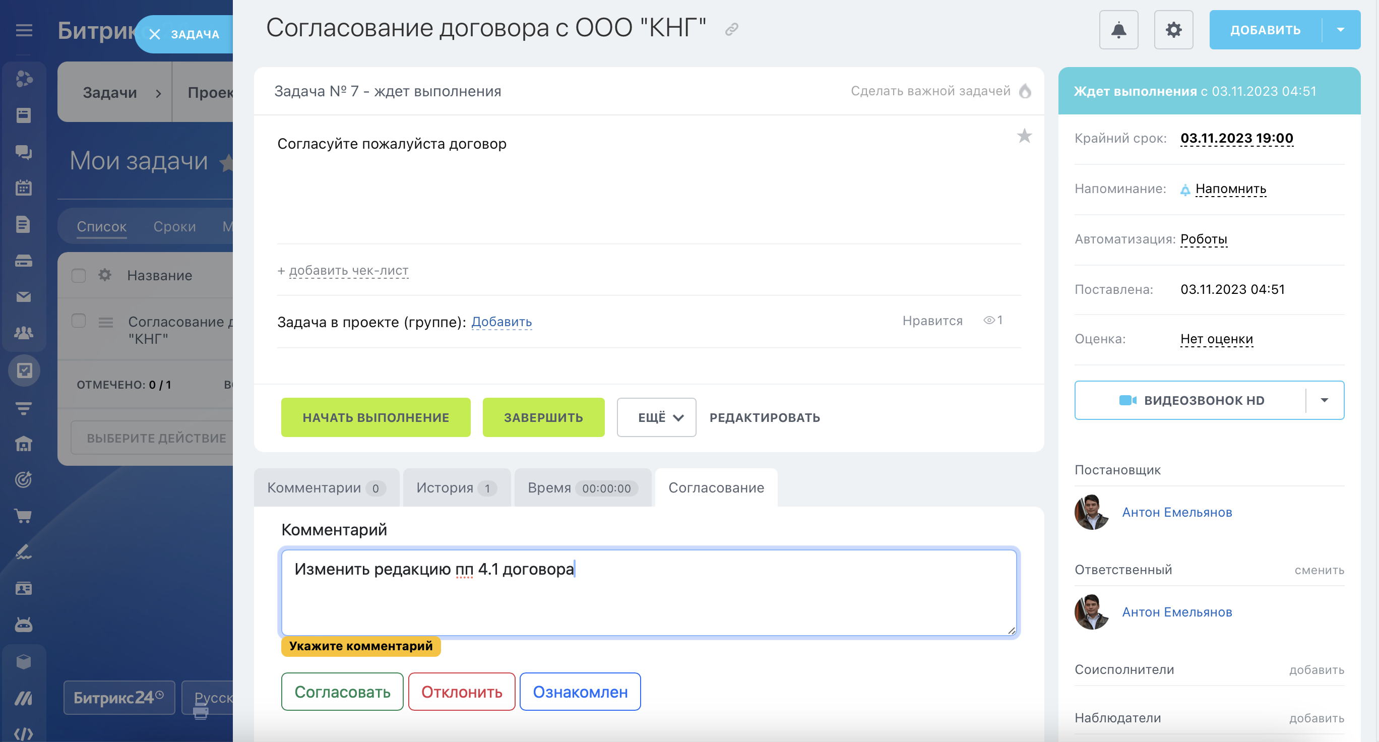 1. Согласование: Пользователь может согласовать задачу. В этом случае в задачу добавляется комментарий и описание - Согласовано. Задача автоматически завершается.