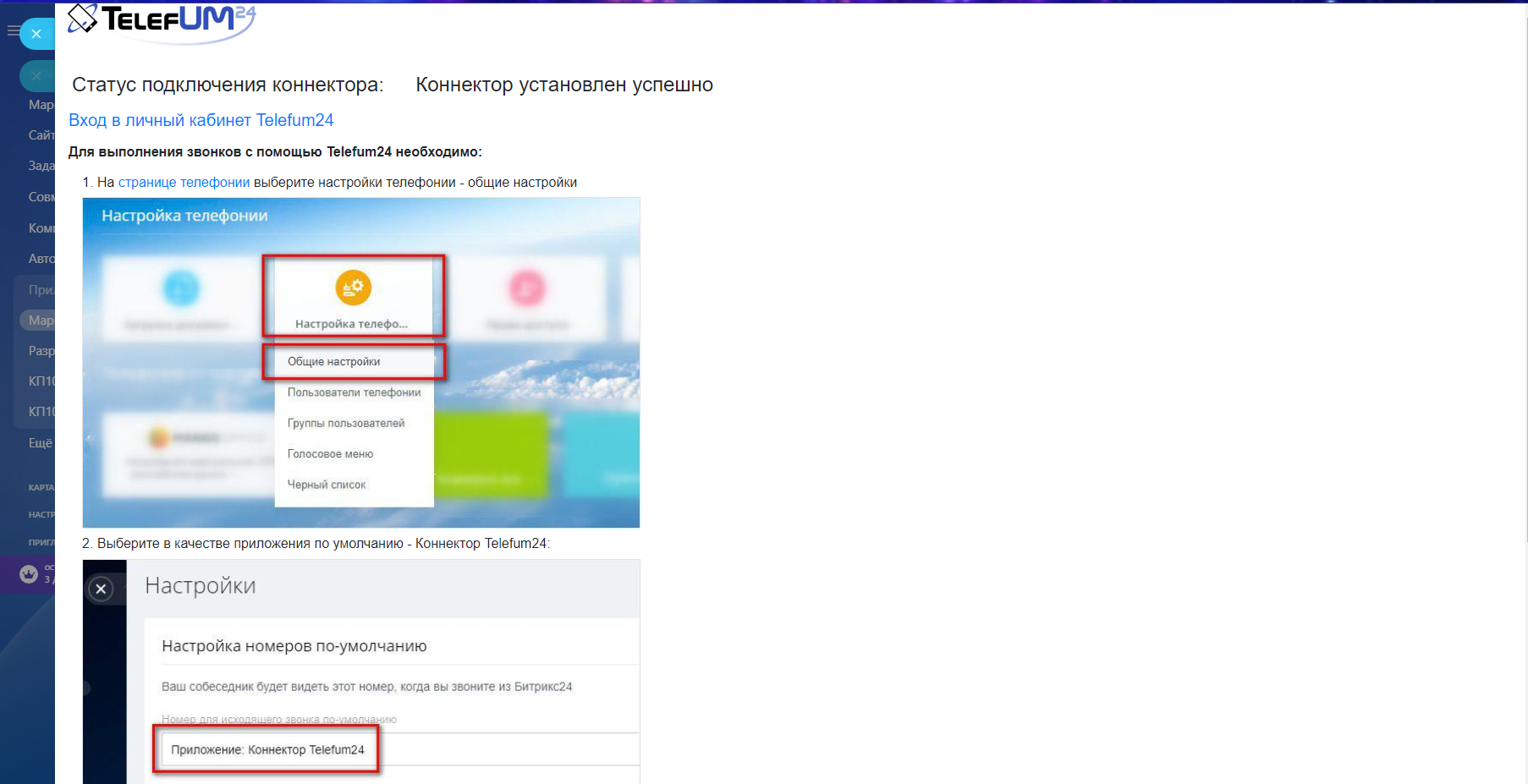 Коннектор Telefum24 представляет собою дополнительное приложение, которое устанавливается совместно со всеми интеграциями, предоставляемыми Telefum24.