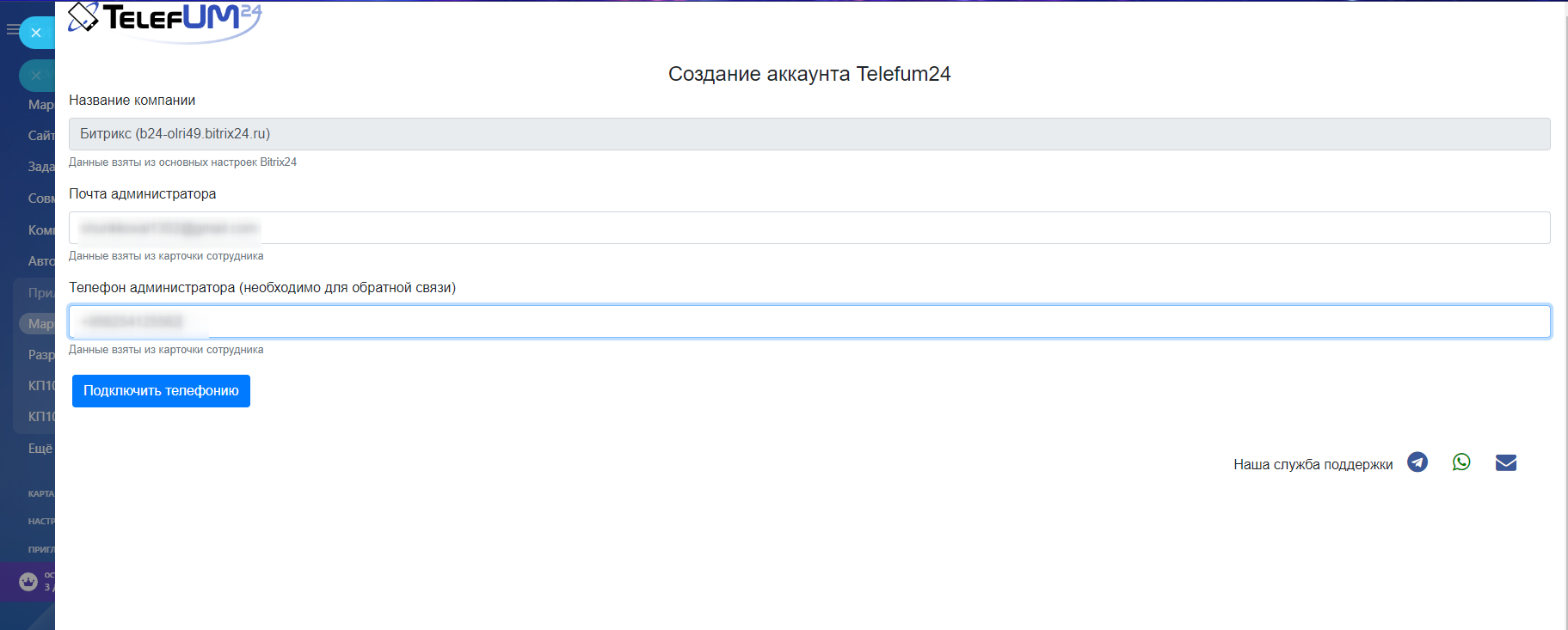 При первой установке данного коннектора - будет предложено автоматически создать личный кабинет в сервисе Telefum24.