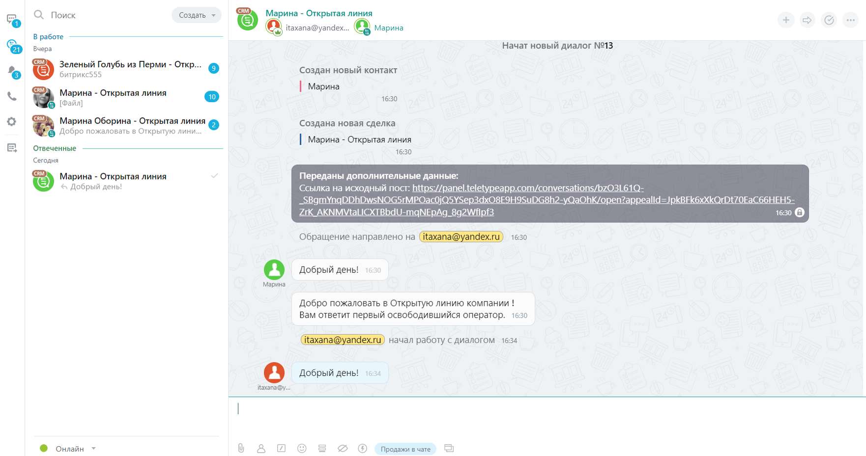 Диалог с каждым клиентом сохраняется в Битрикс24