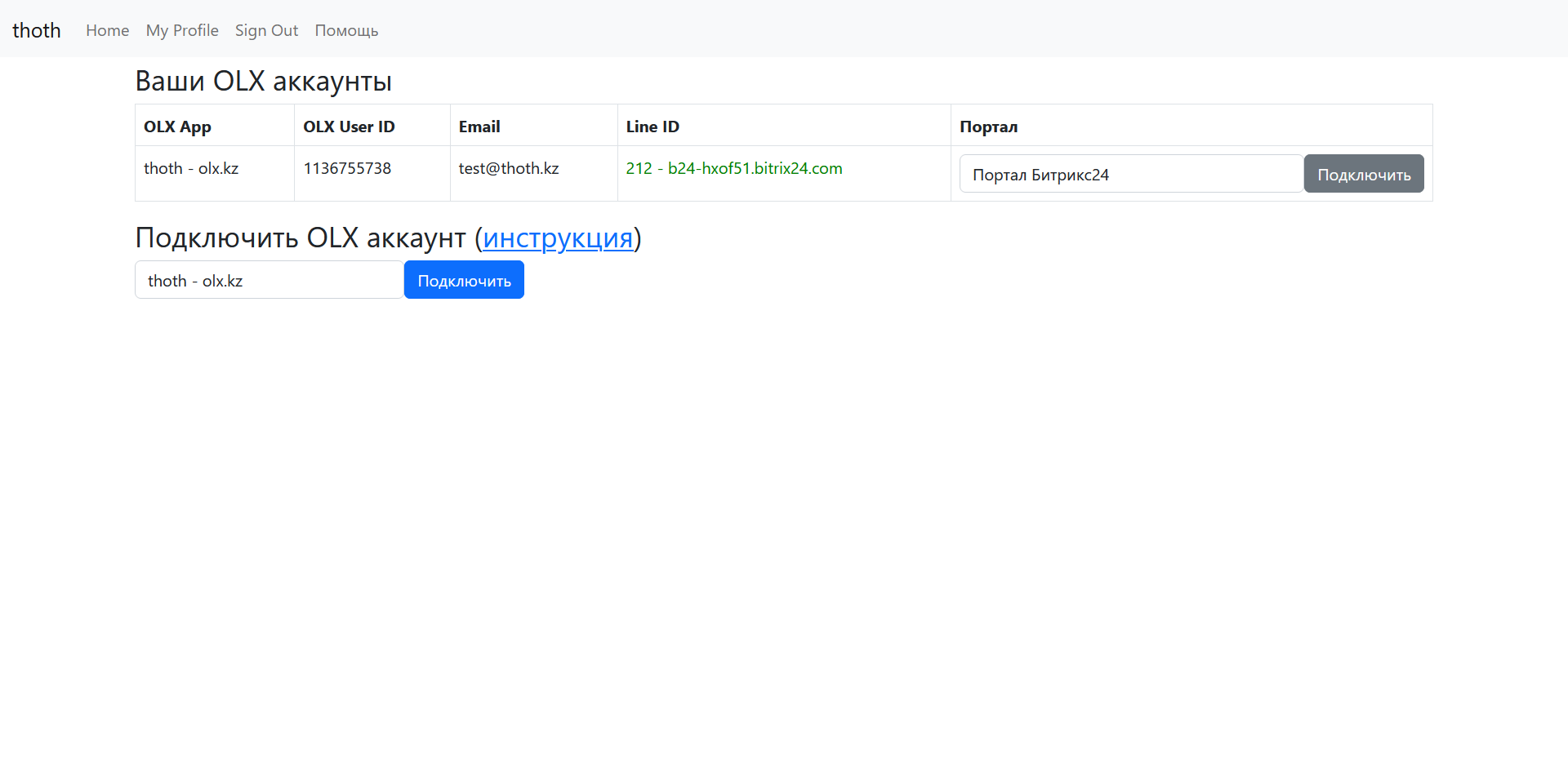 - Подключение внешних систем: Интеграция осуществляется через API OLX и Bitrix24
