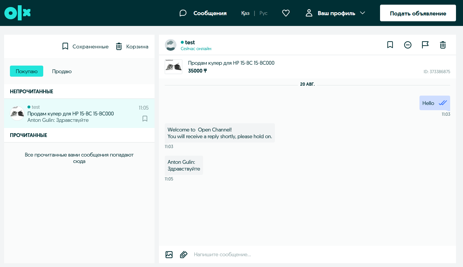 - Обмен сообщениями с клиентами в сервисе объявлений OLX.kz (https://www.olx.kz/)