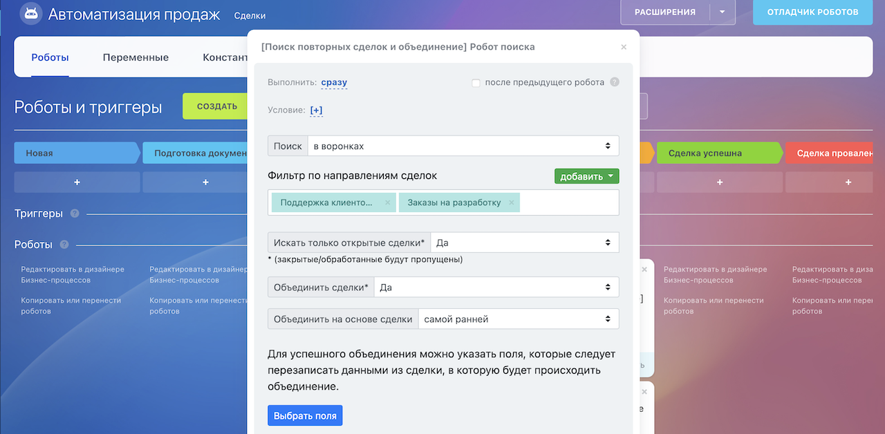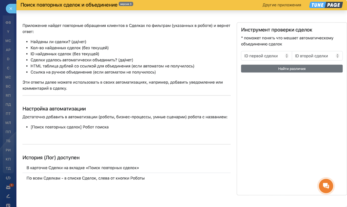 Приложение позволит найти повторные обращения клиентов, которые падают в Сделки и объединить их (при необходимости).