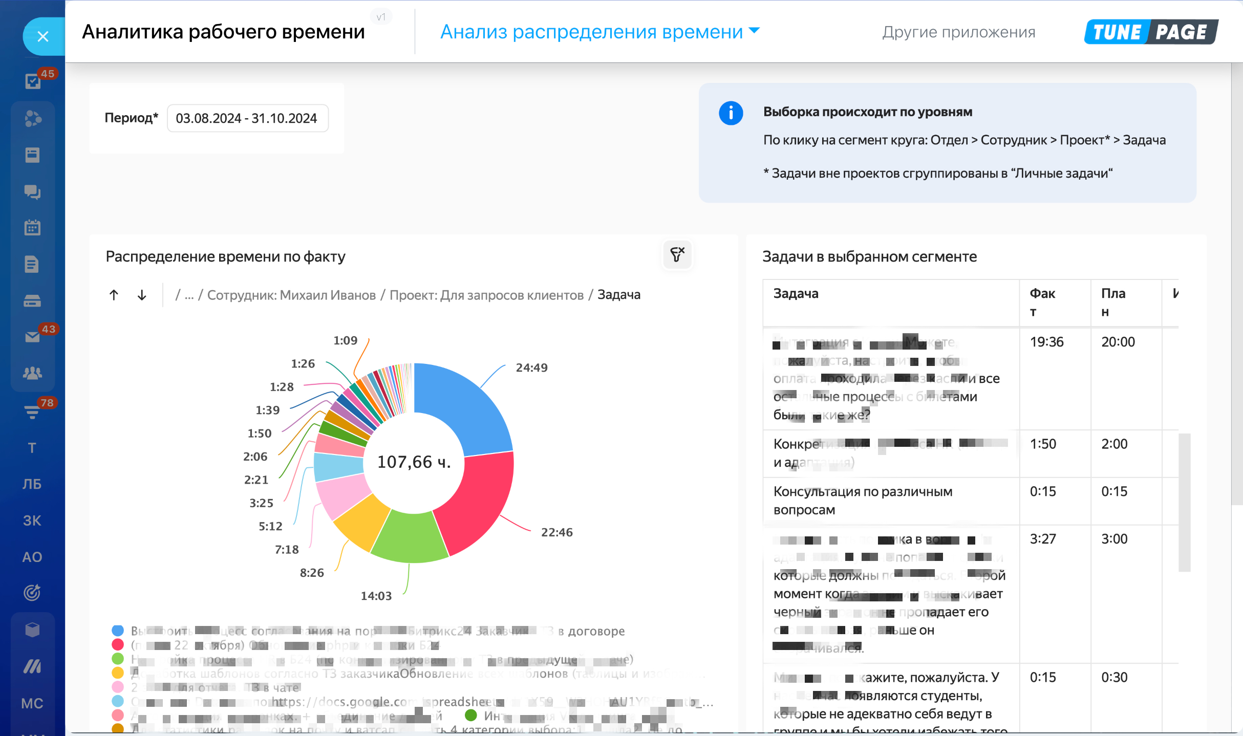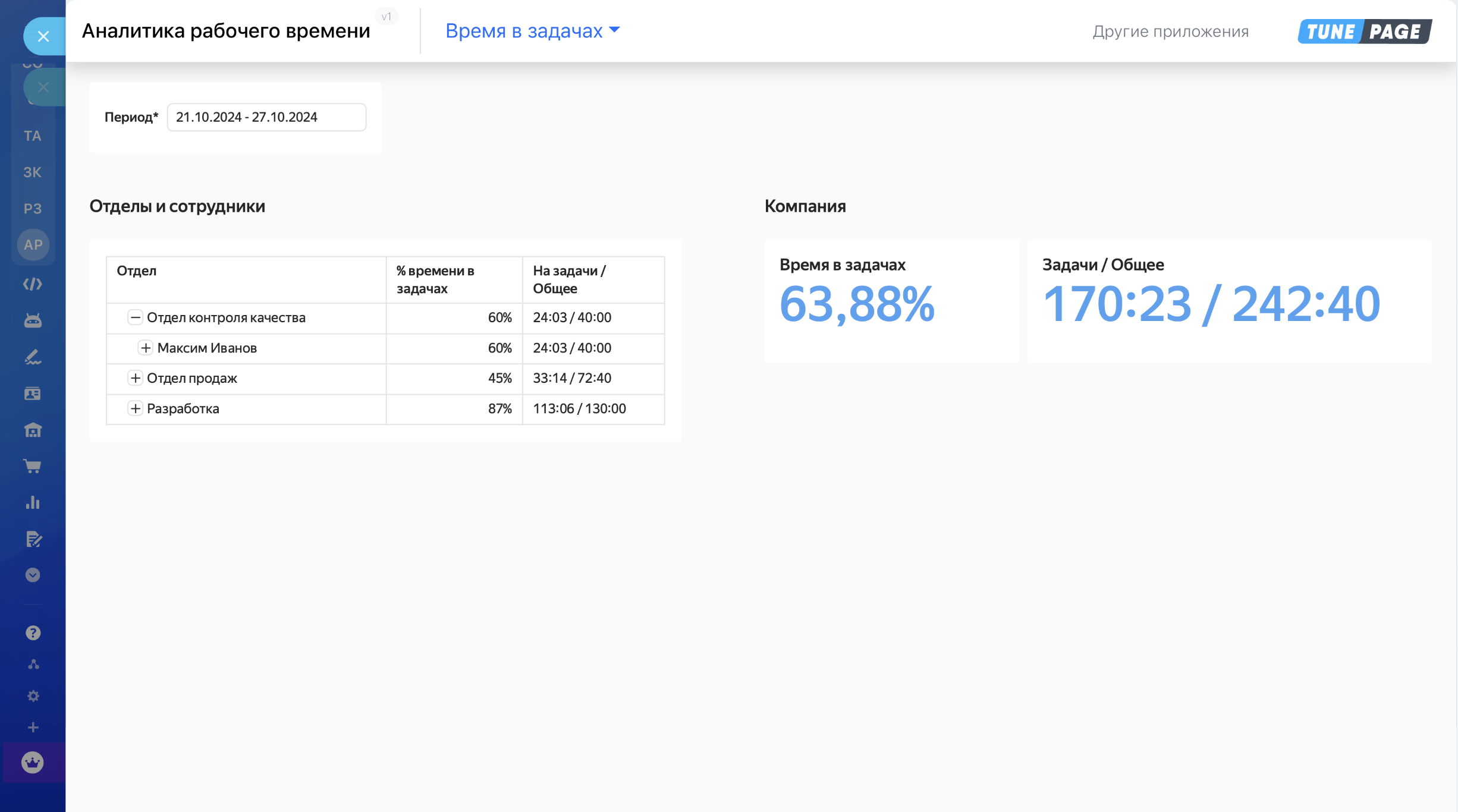 Приложение «Аналитика рабочего времени» — это инструмент для анализа рабочего времени сотрудников, времени на задачи и рентабельности проектов. Помогает выявить отклонения фактического времени от планового, что позволяет оптимизировать процессы и повышать продуктивность.