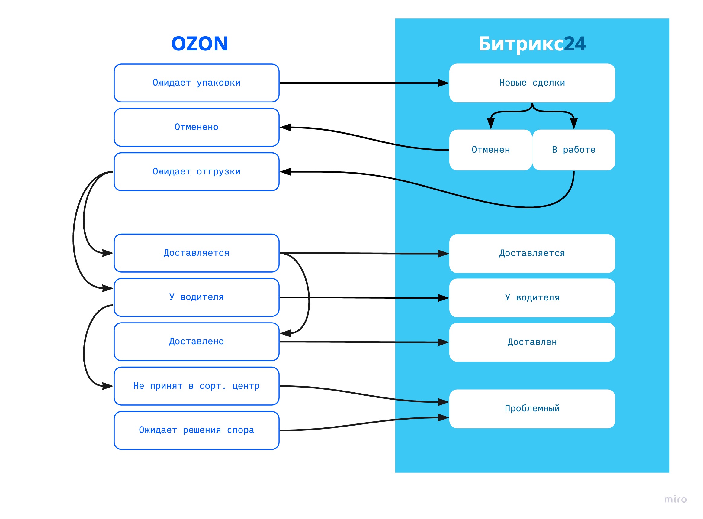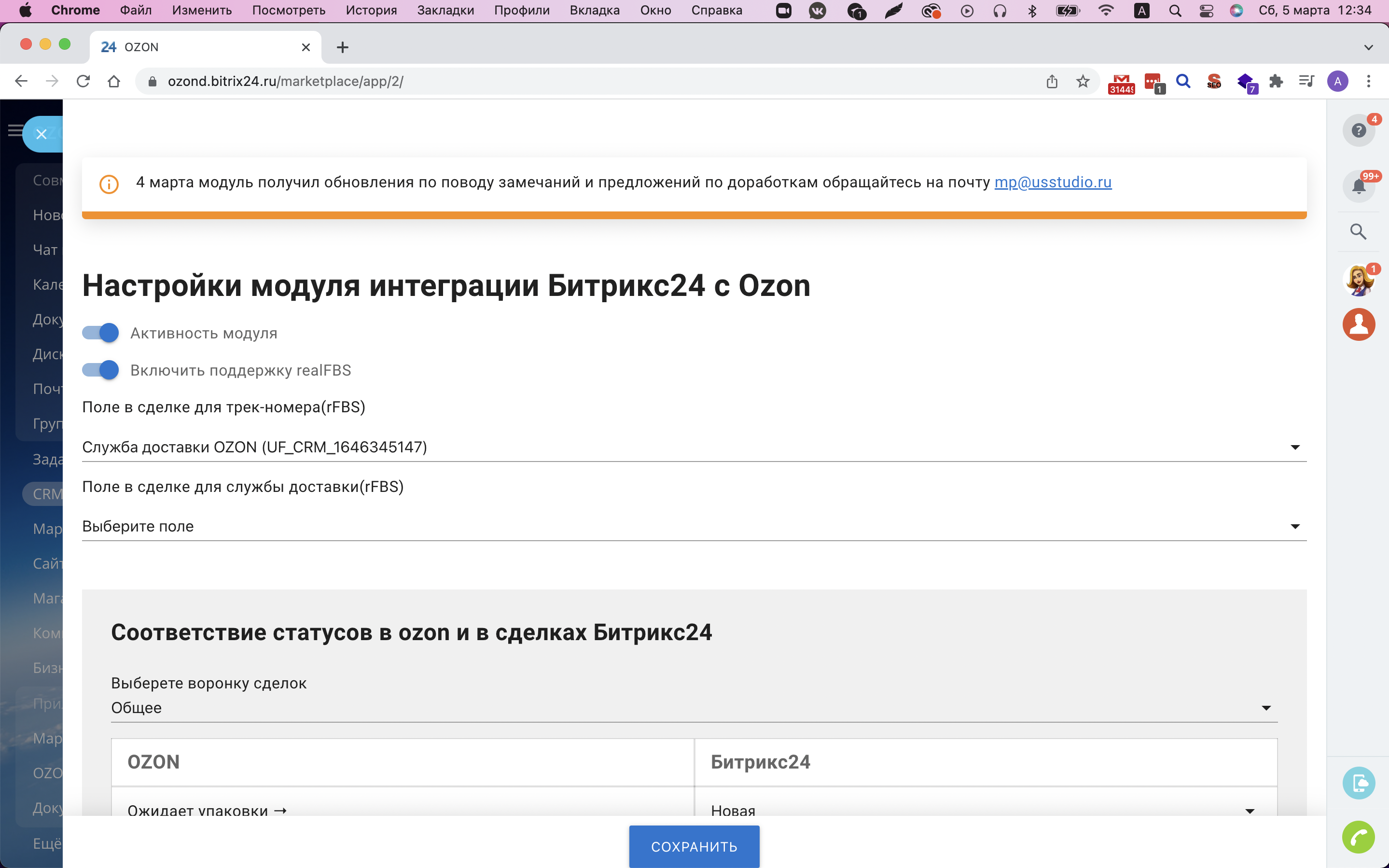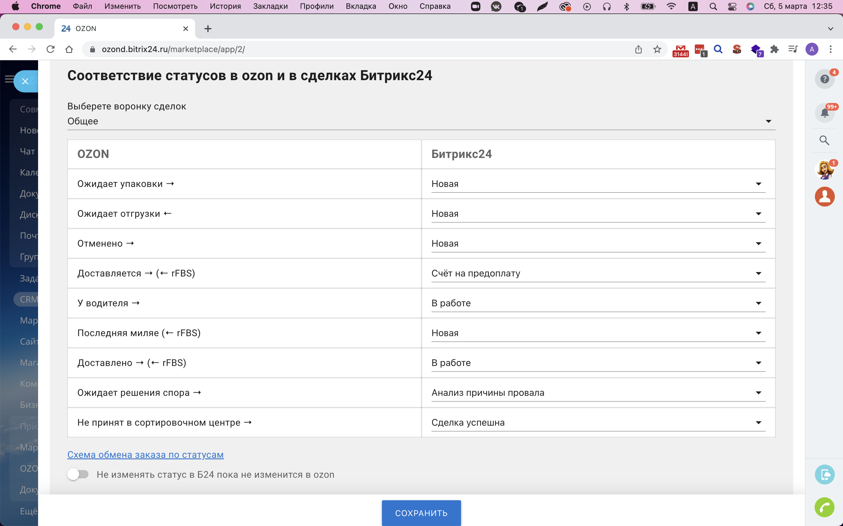 - Менять статусы сделки в Б24 из OZON
