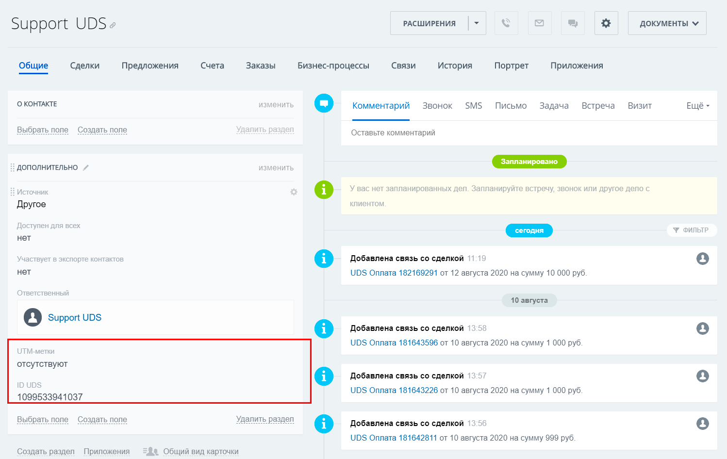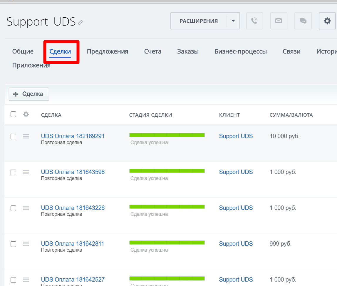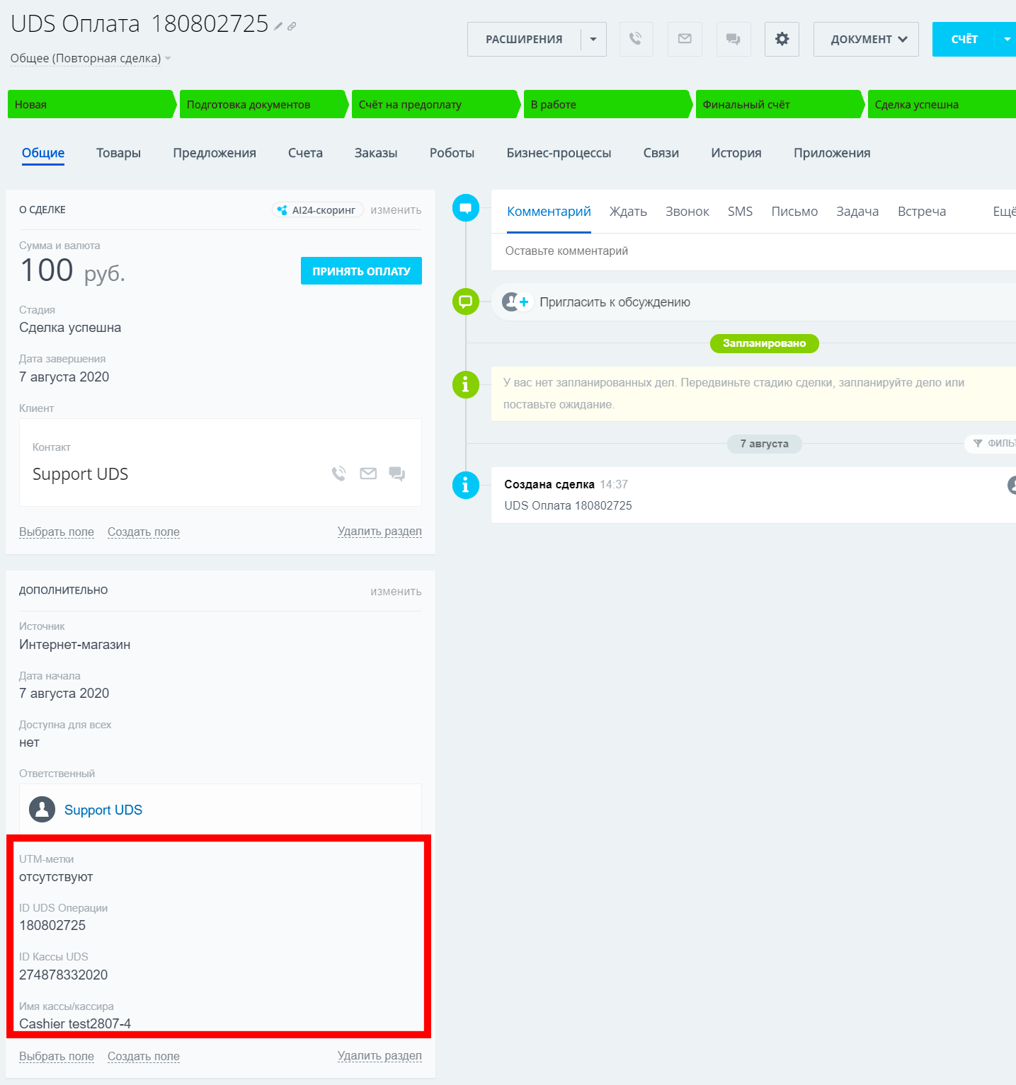 При фиксировании оплаты через UDS в CRM создаётся новая сделка и тут же закрывается с успехом. Если у контакта имеется открытая сделка, то она закрывается суммой из UDS