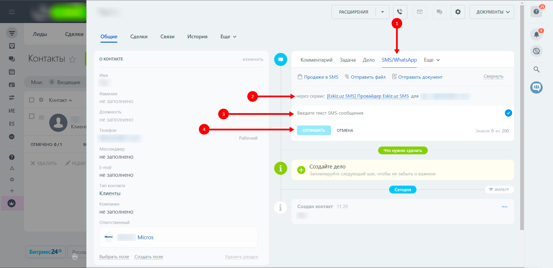 Сообщение лиду, контакту, компании, сотруднику, на произвольный номер.