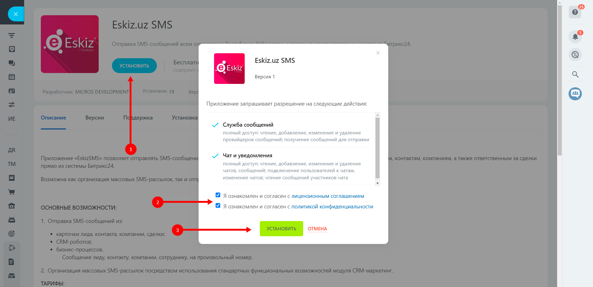 Приложение «EskizSMS» позволяет отправлять SMS-сообщения из системы «1С-Битрикс24» через сервис SMS-провайдера «Eskiz.uz» лидам, контактам, компаниям, а также ответственным за сделки прямо из системы Битрикс24.