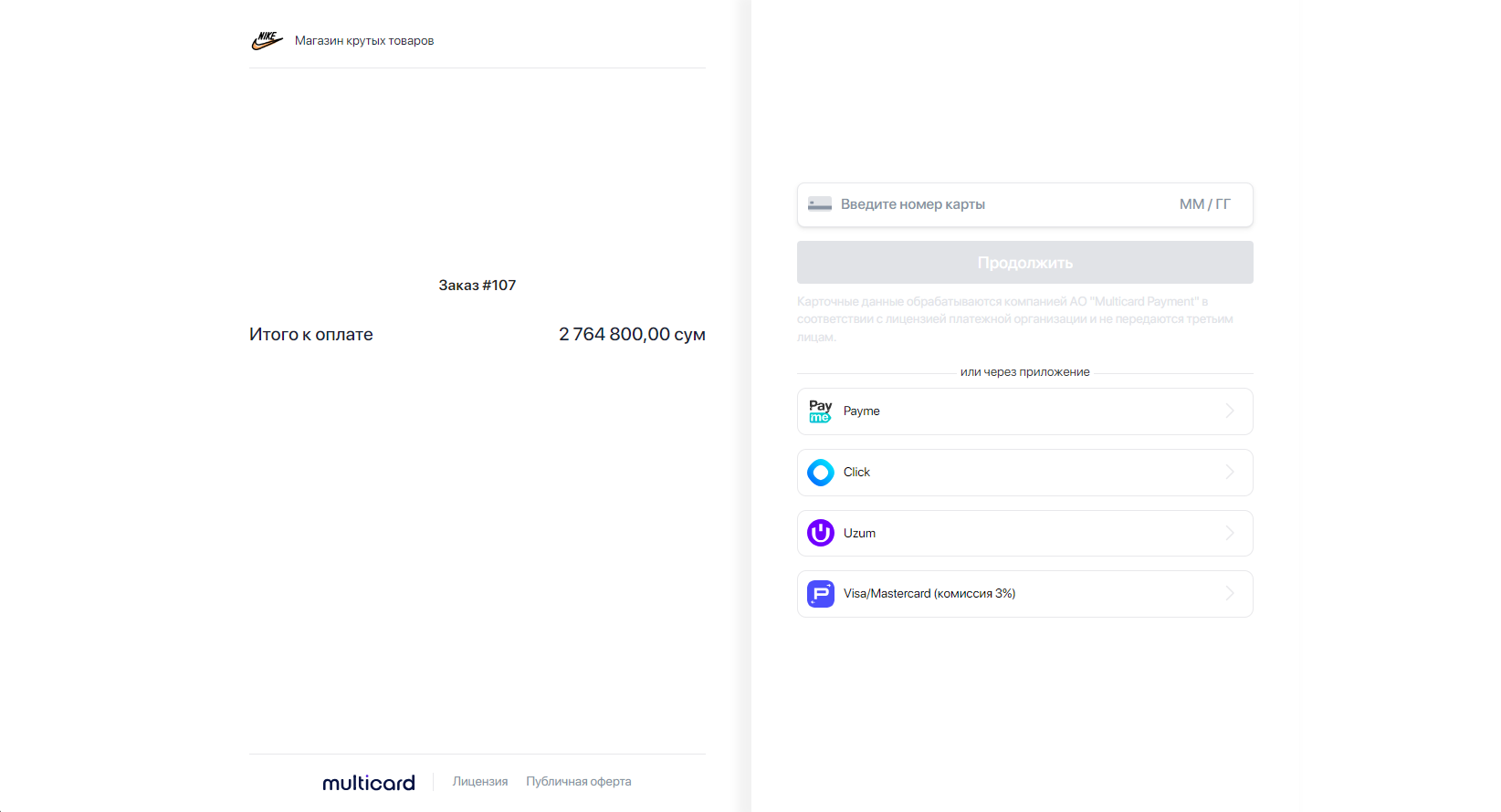 Платежный модуль Multicard позволит Вам принимать оплату от клиентов через платёжные системы Узбекистана (UzCard, HUMO, Visa, MasterCard, Multicard, Payme, Click, Uzum, Корпоративные карты)