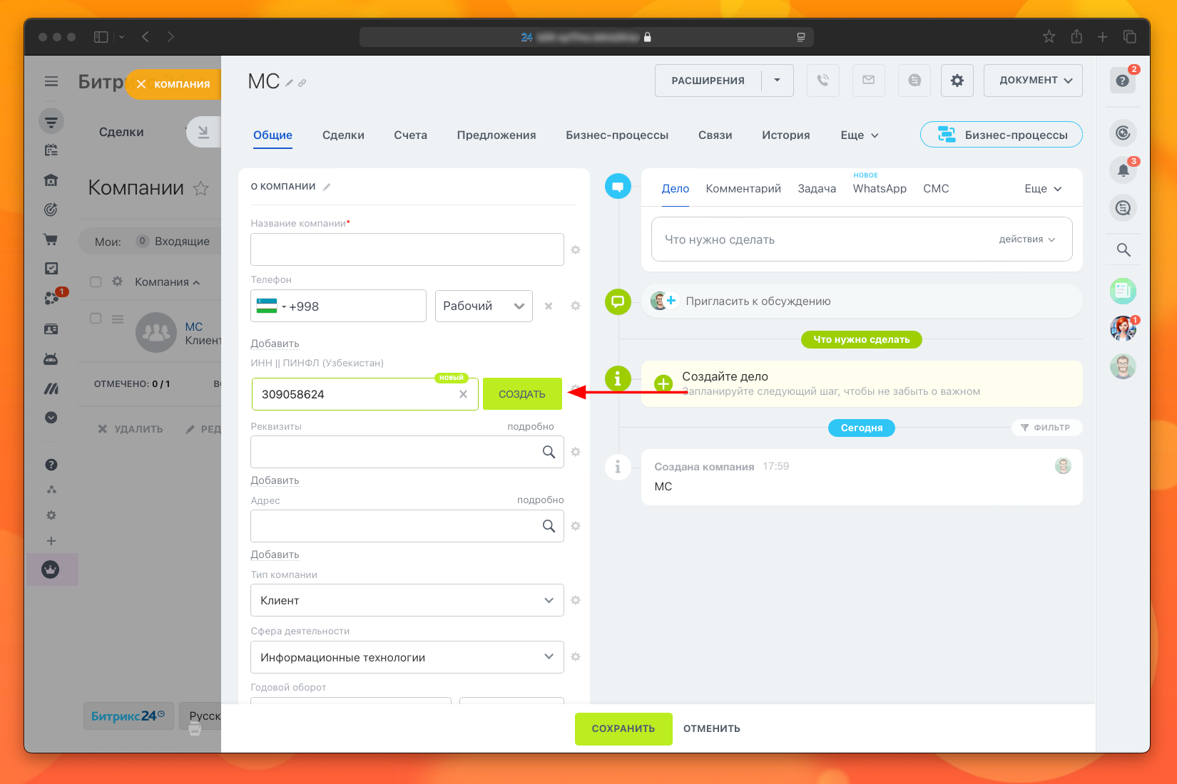 - Введите в него ИНН (если Компания) или ПИНФЛ (если Контакт)