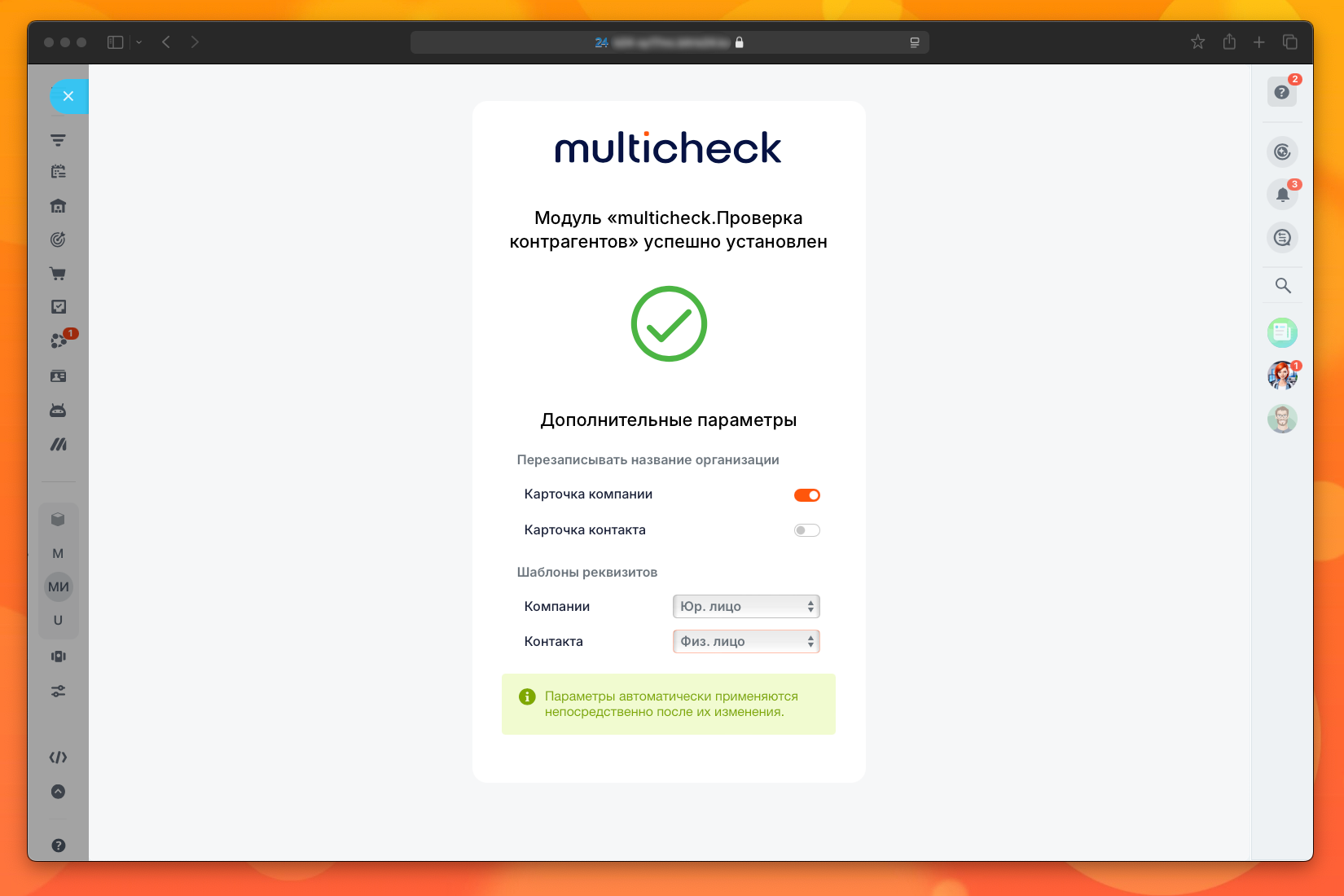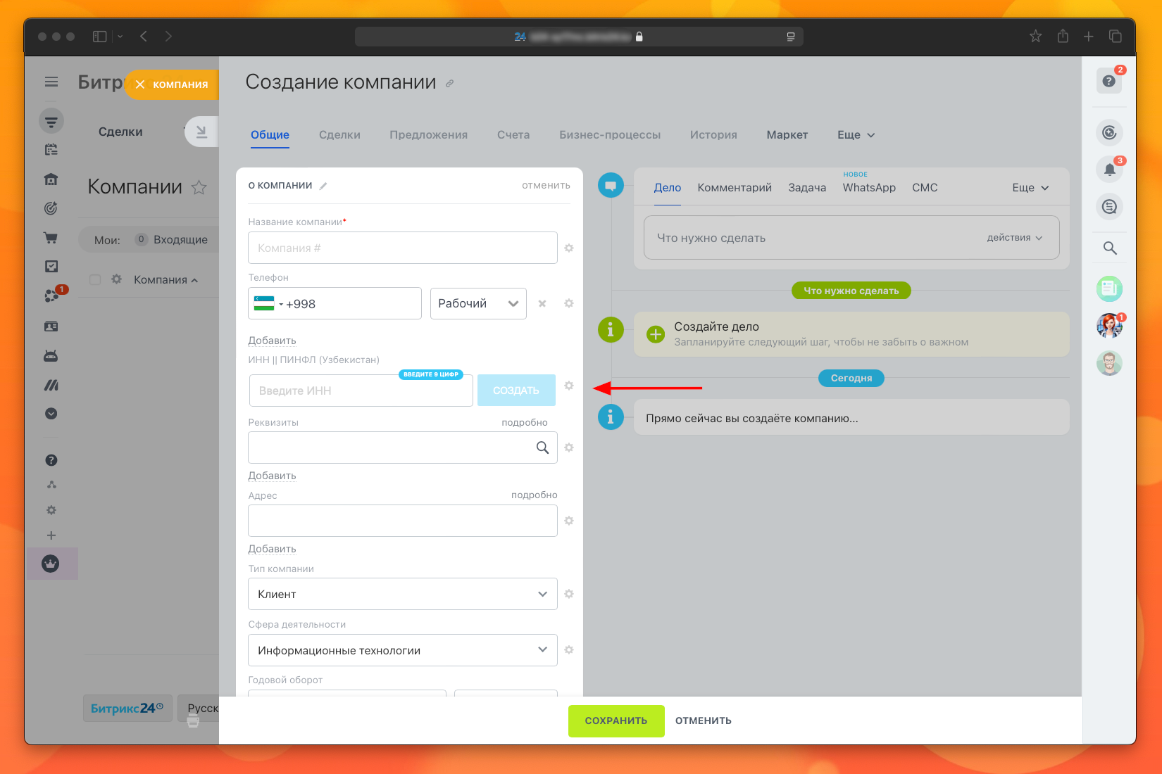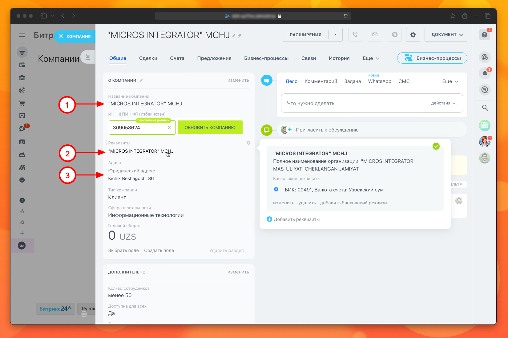 Данный модуль позволяет автоматически заполнять реквизиты компании и контакта. Для этого достаточно ввести ИНН или ПИНФЛ в пользовательское поле “ИНН || ПИНФЛ (Узбекистан)” в карточке клиента. Также реализовано привязка клиента в карточке сделки. Поиск осуществляется по юридическим и физическим лицам Республики Узбекистан.
