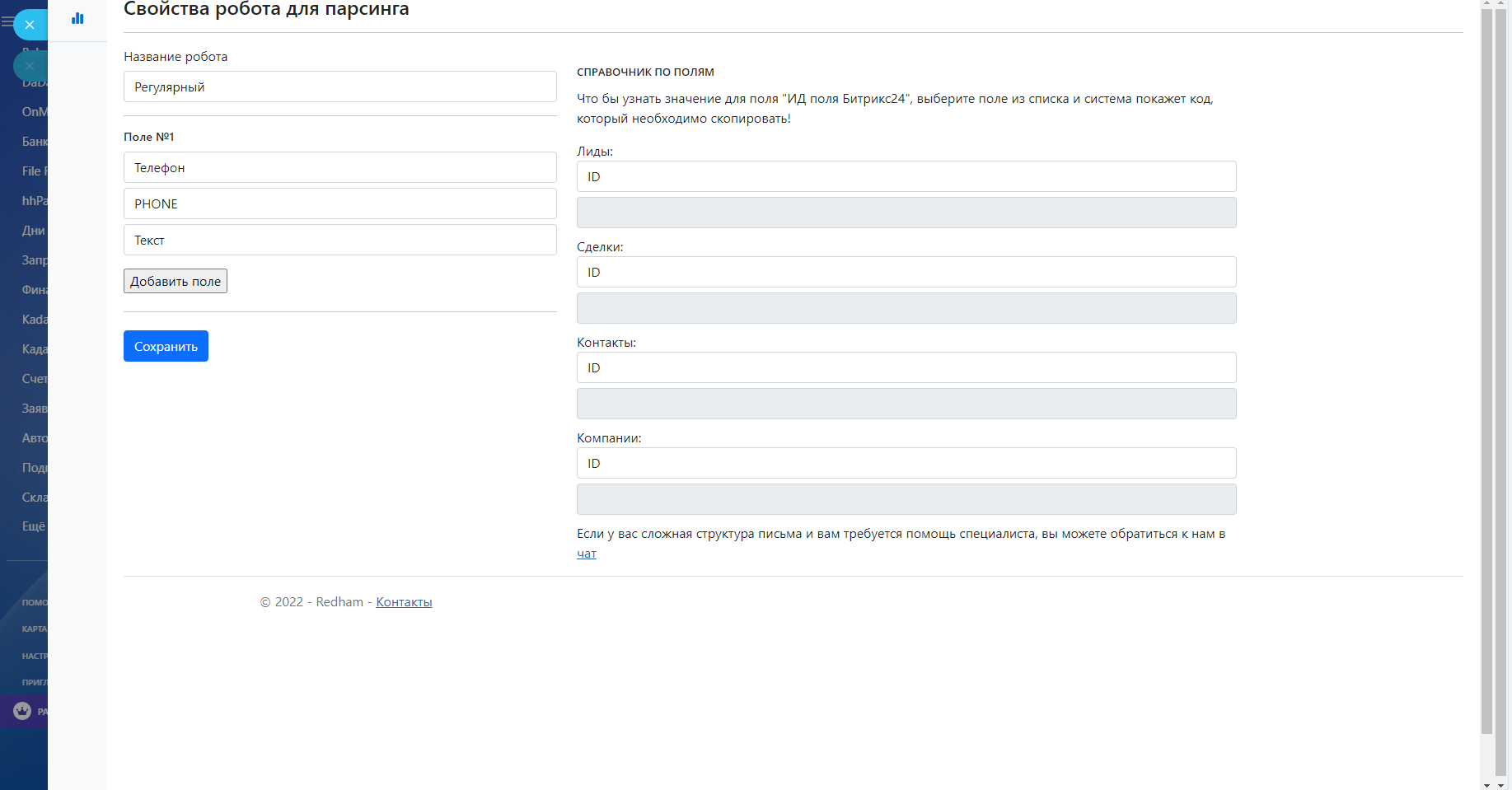 Приложение помогает получать данные из входящих писем. Для работы вы можете создавать несколько роботов настроенных под разные шаблоны писем. Если вы используете почту для получения лидов с сайта и других сервисов, данное приложение поможет взять контакты, имя, название объекта и другие характеристики прям из текста письма.