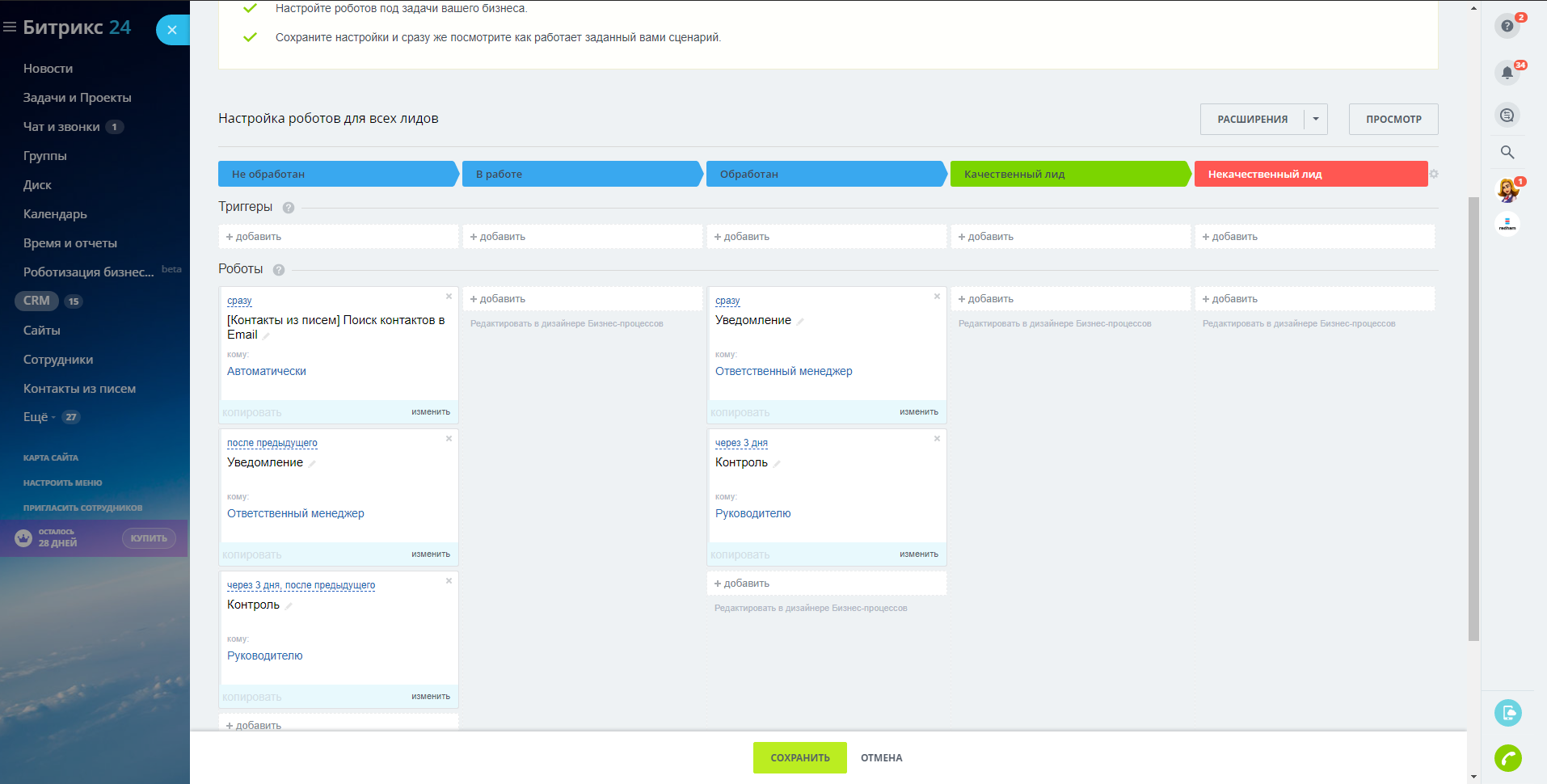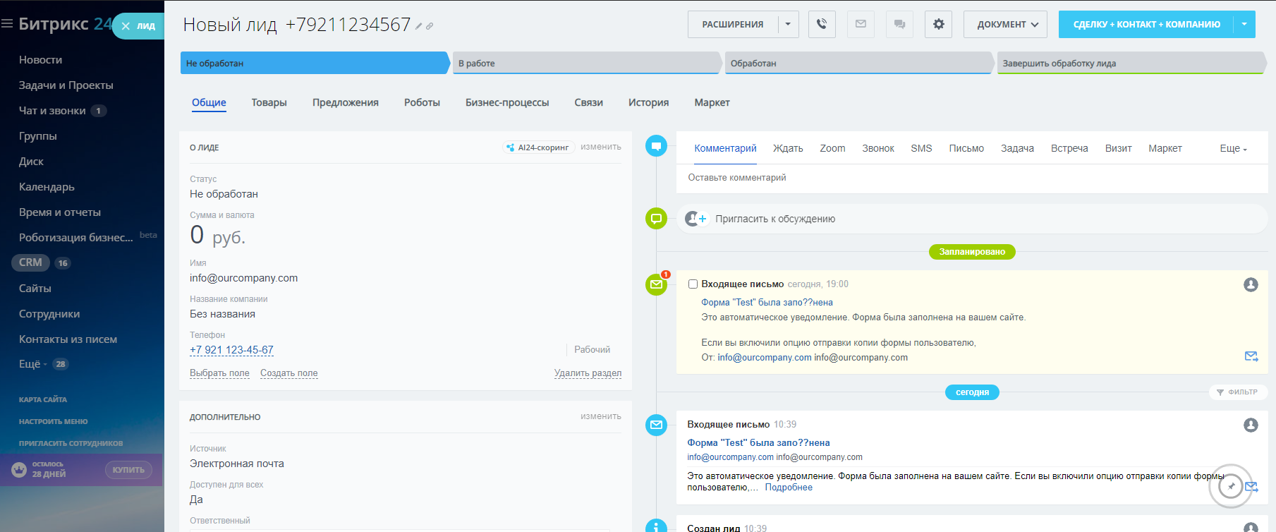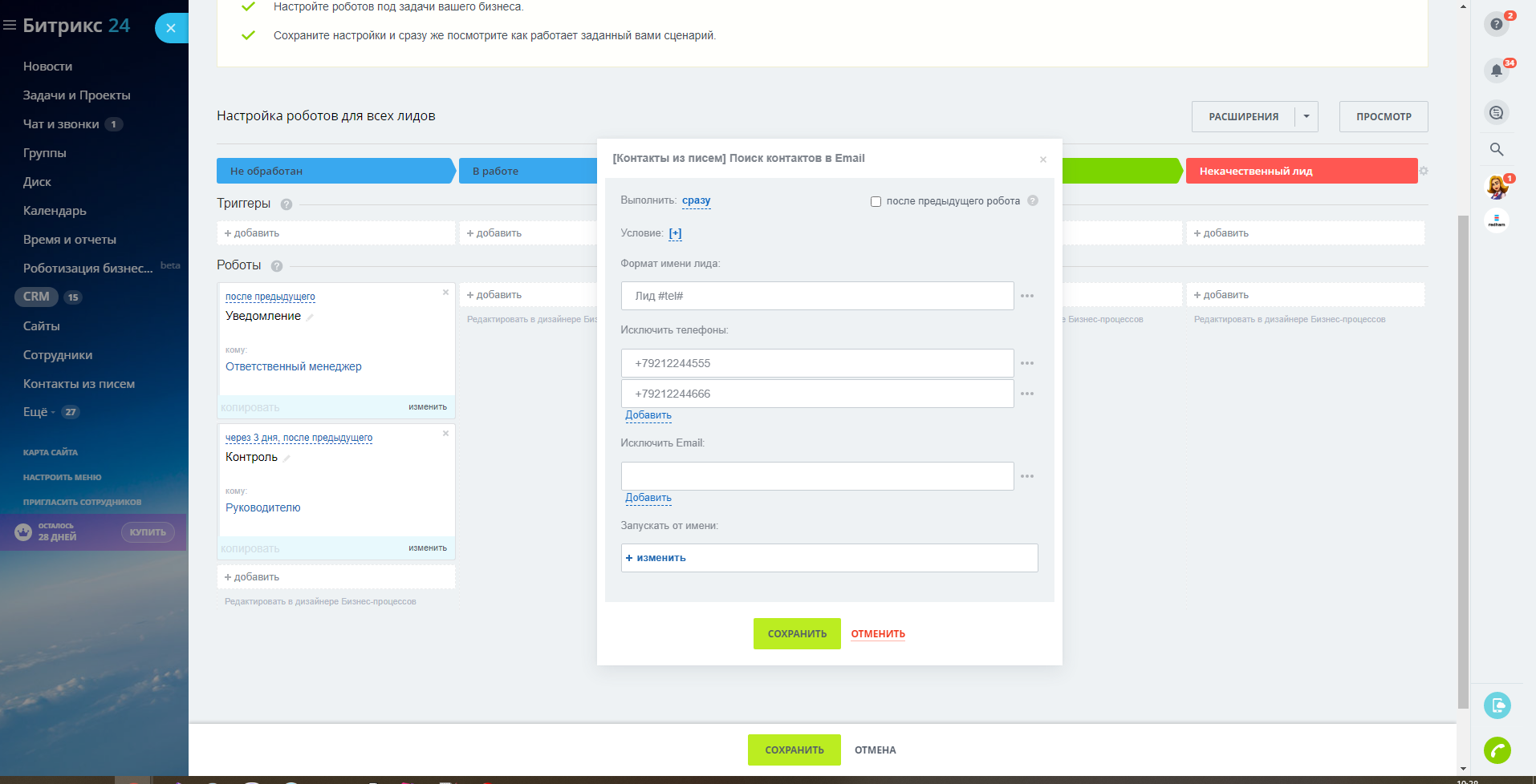 Если робот используется в "лидах", то будет добавлены e-mail и телефон в карточку лида. В случае если указан шаблон названия лида, он так же будет переименован.