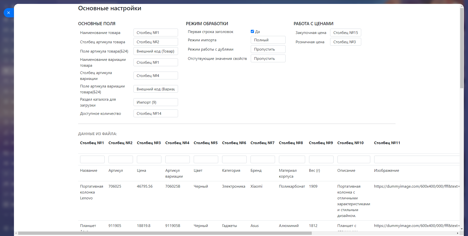 Загружайте весь ассортимент — от простых товаров до сложных вариаций. Просто выберите Excel-файл и укажите нужные поля.