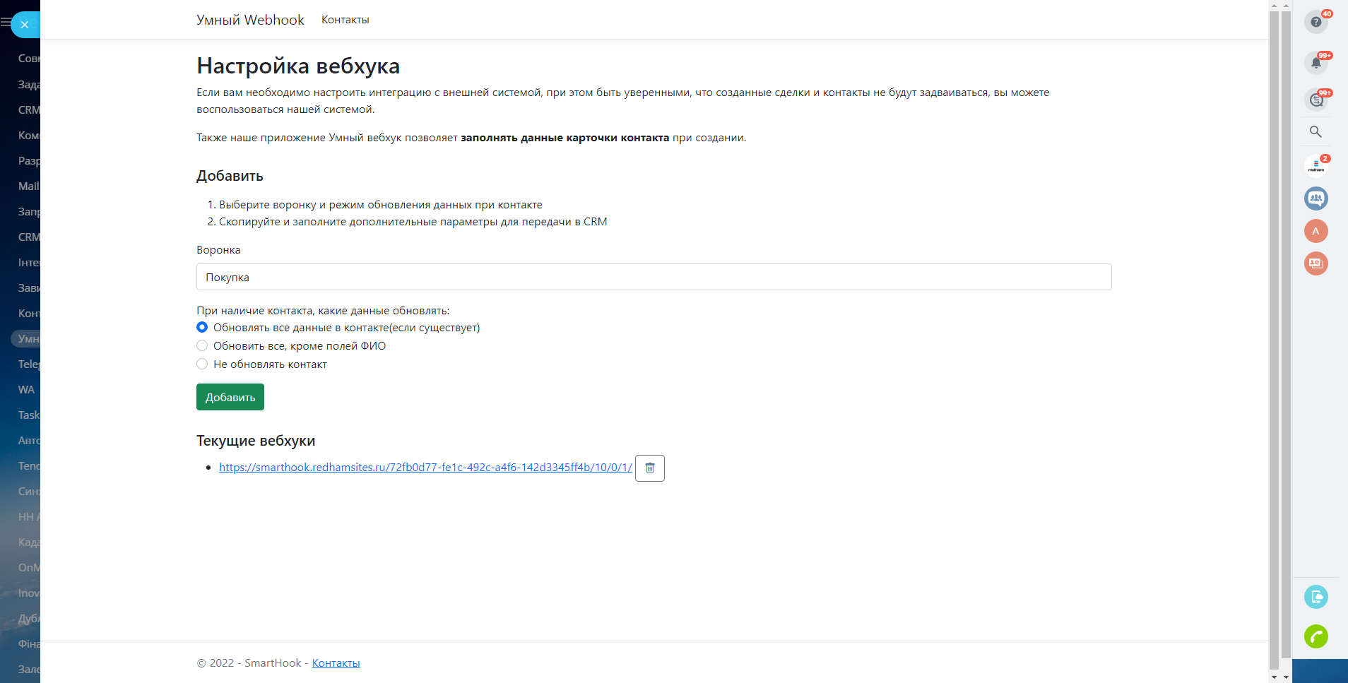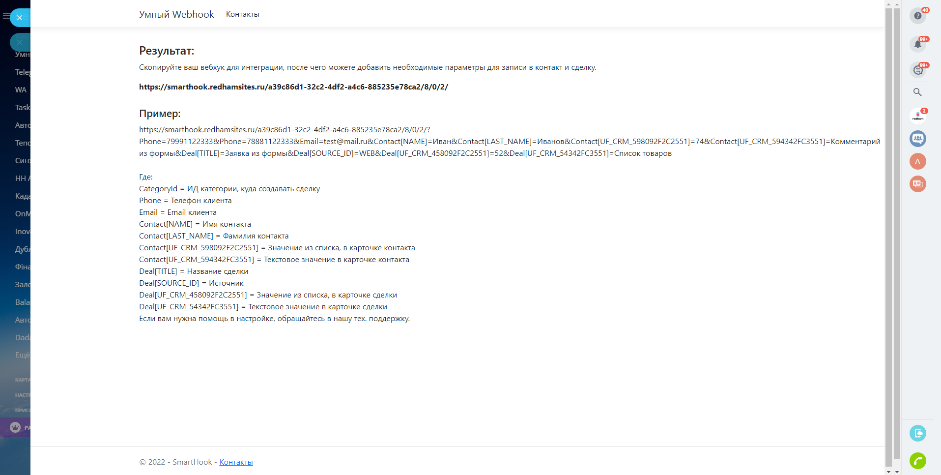 Приложение облегчает интеграцию с разными сервисами и сайтами. Используя наш вебхук, вы избавитесь от проблемы дублей, необходимости писать собственные интеграции для передачи дополнительных полей в сделку и контакт, если работаете с системой без лидов. Все параметры передаются на наш вебхук, который уже создает и заполняет все данные в карточках, не создавая дублей.