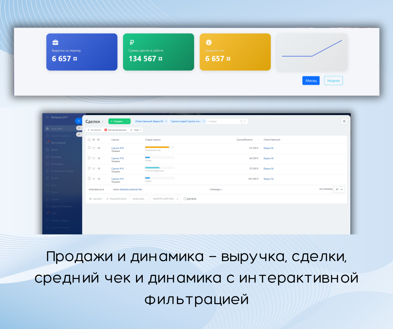 - Продажи и динамика - выручка, сделки в работе, средний чек, динамика по выбранным периодам, с интерактивной фильтрацией и переходом к спискам сделок.