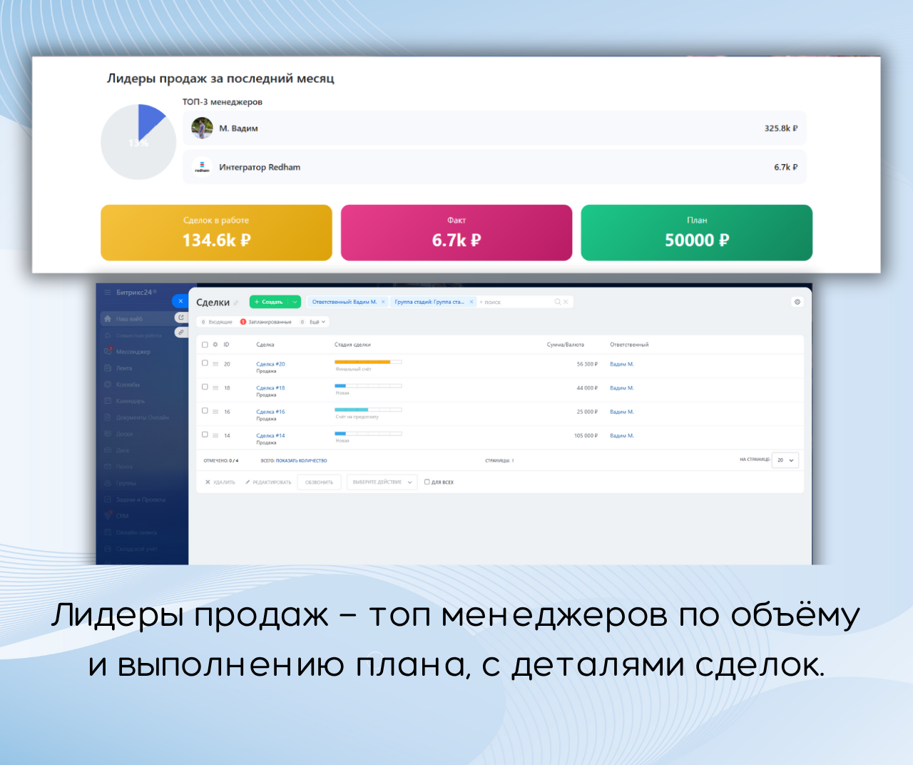 - Лидеры продаж - топ менеджеров по объёму продаж и выполнению плана, с возможностью углубиться в детали их сделок.