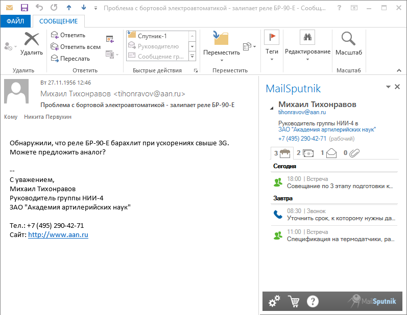 MailSputnik загружает информацию о клиентах из Битрикс24 и показывает ее рядом с электронным письмом в Outlook.