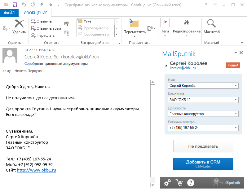 MailSputnik распознает контактную информацию в тексте письма, проверяет клиента в Битрикс24 и, если его нет в базе, предлагает сохранить одним кликом из Outlook!