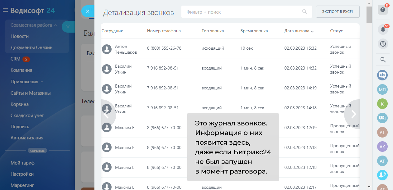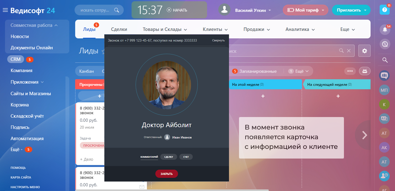 - Карточка клиента появляется в Битрикс24, как только звонит телефон — ещё до того, как сотрудник взял трубку!;