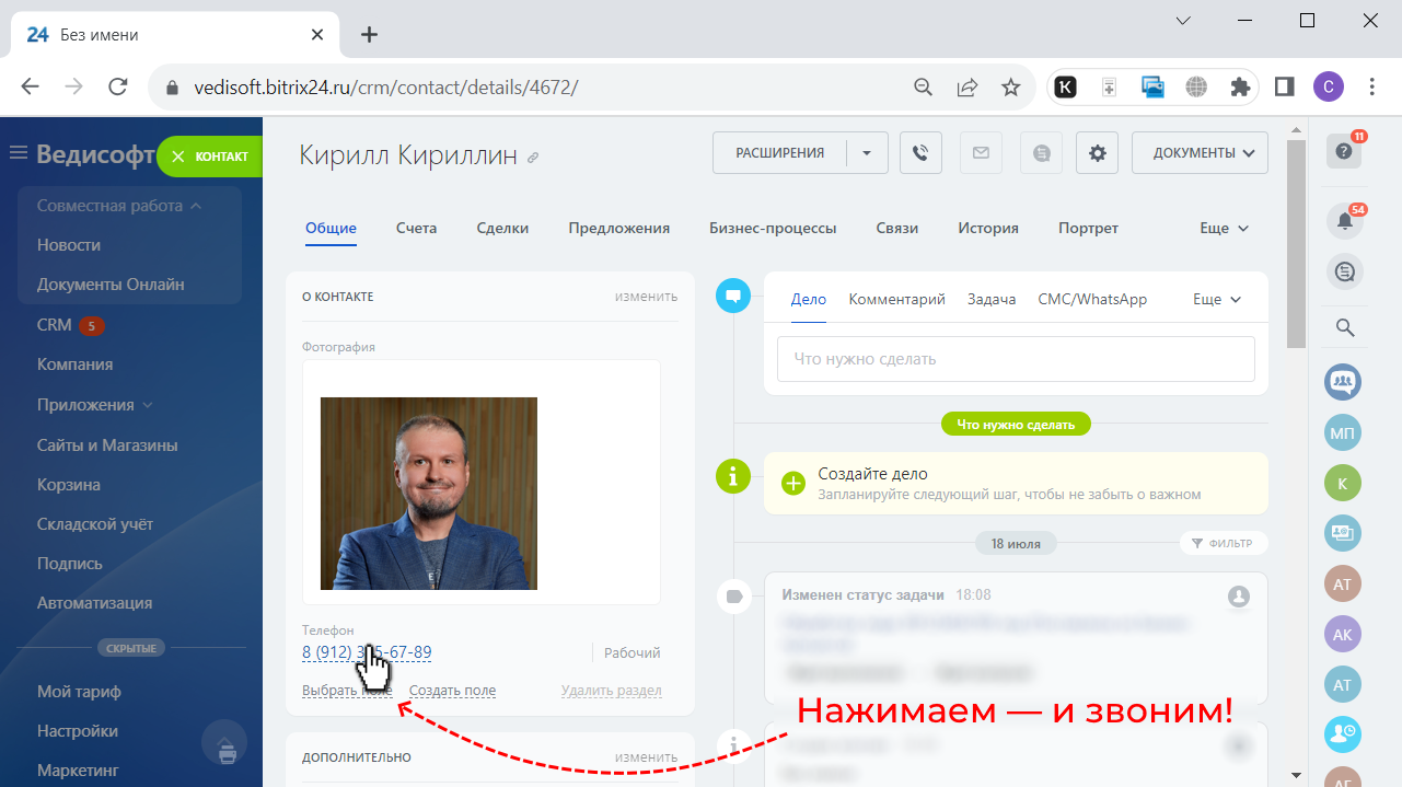 - Просто кликните по номеру клиента в Битрикс24 — и «Простые Звонки» сами его наберут!