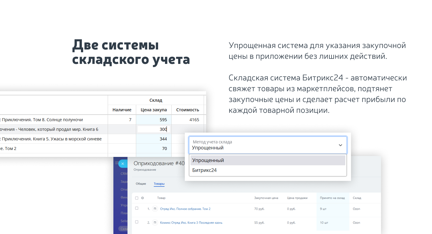 - базовый функционал учета склада, с двумя схемами - упрощенной и с плотной интеграцией складского учета на Битрикс24;